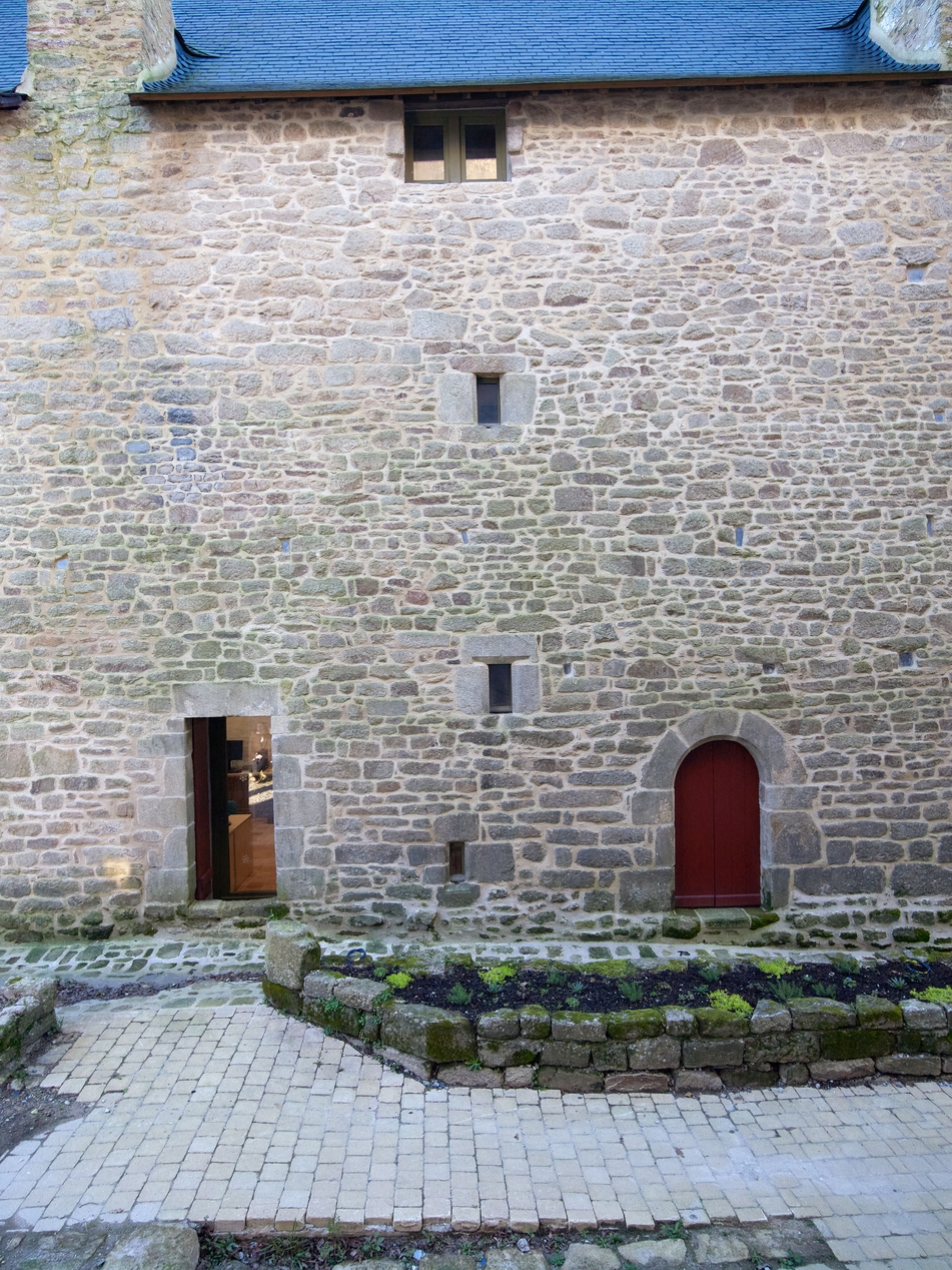 Vue depuis le nord-est du mur gouttereau. Les petites ouvertures verticales marquent l'emplacement de l'escalier en vis.Immatriculation