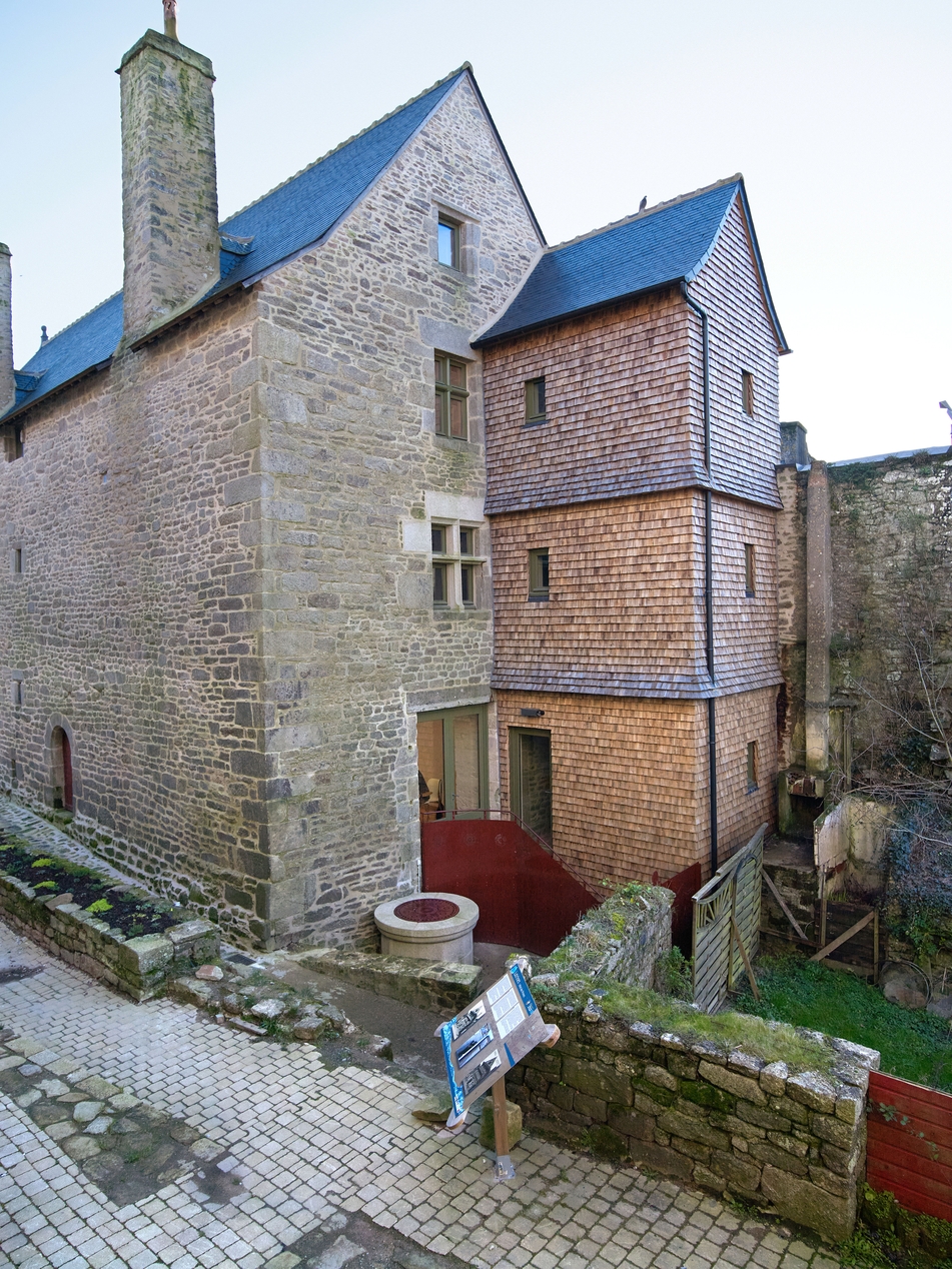 Vue du pignon nord. Un ascenseur a été installé dans une tour à l'emplacement des anciennes latrines.Immatriculation