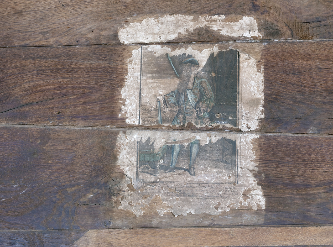 Gravure collée sur la cloison en bois.Immatriculation