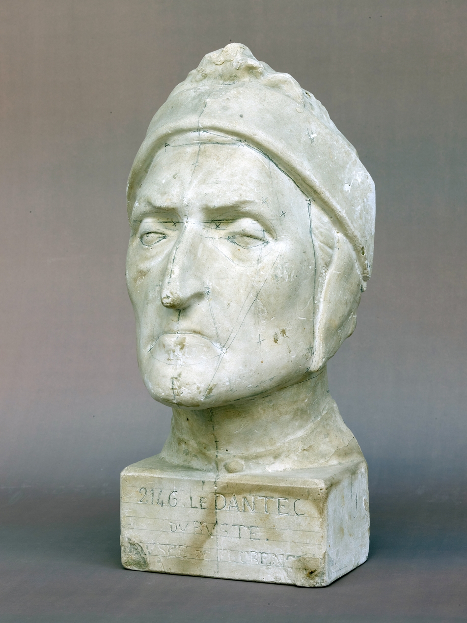 Dante, réalisé d’après le masque funéraire. Italie, 15e siècle. Original conservé au musée du Bargello à Florence. École nationale supérieure des Beaux-arts (cat. vente n°2146). Noter l'humour potache et... vernaculaire.Immatriculation