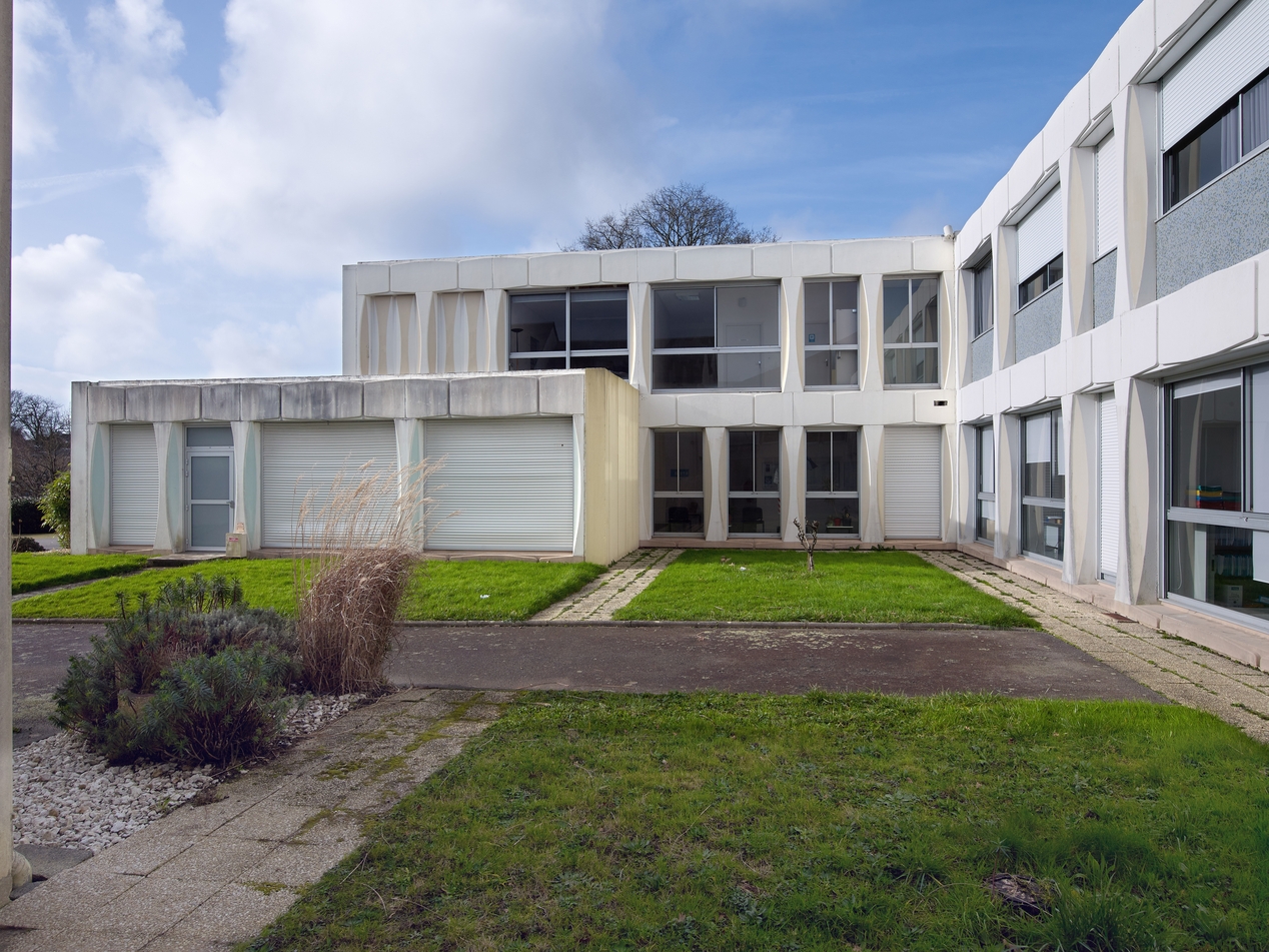 Façades sud-est de l'infirmerie et de l'administration, à droite, façade de l'externat. Noter la modénature, faite notamment de nuances de couleur et d'alternance de matériaux. Yves Guillou, architecte, 1980).Immatriculation