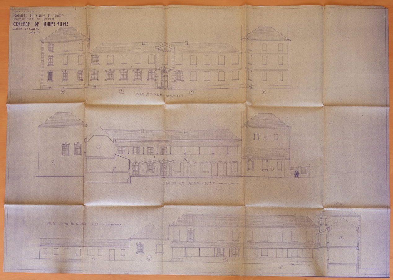 Élévations et coupes du collège de jeunes filles de Lorient, détruit pendant la Seconde Guerre mondiale, dressées afin de chiffrer les dommages de guerre.Immatriculation