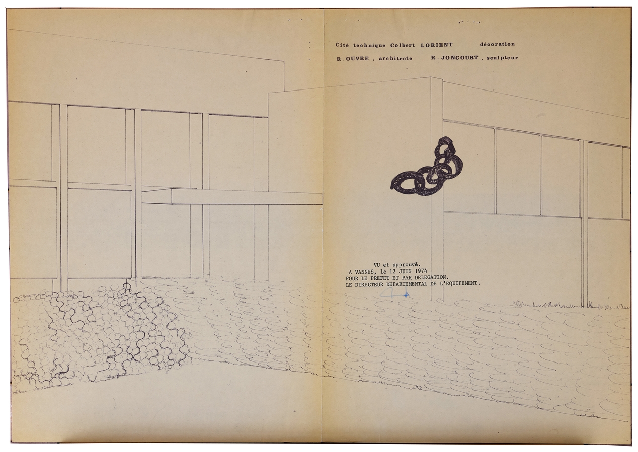 Élévation de la façade du gymnase et maquette de la décoration. René Ouvré, architecte, Roger Joncourt, sculpteur. "Vu et approuvé" par le directeur départemental de l'équipement le 12 juin 1974.Immatriculation