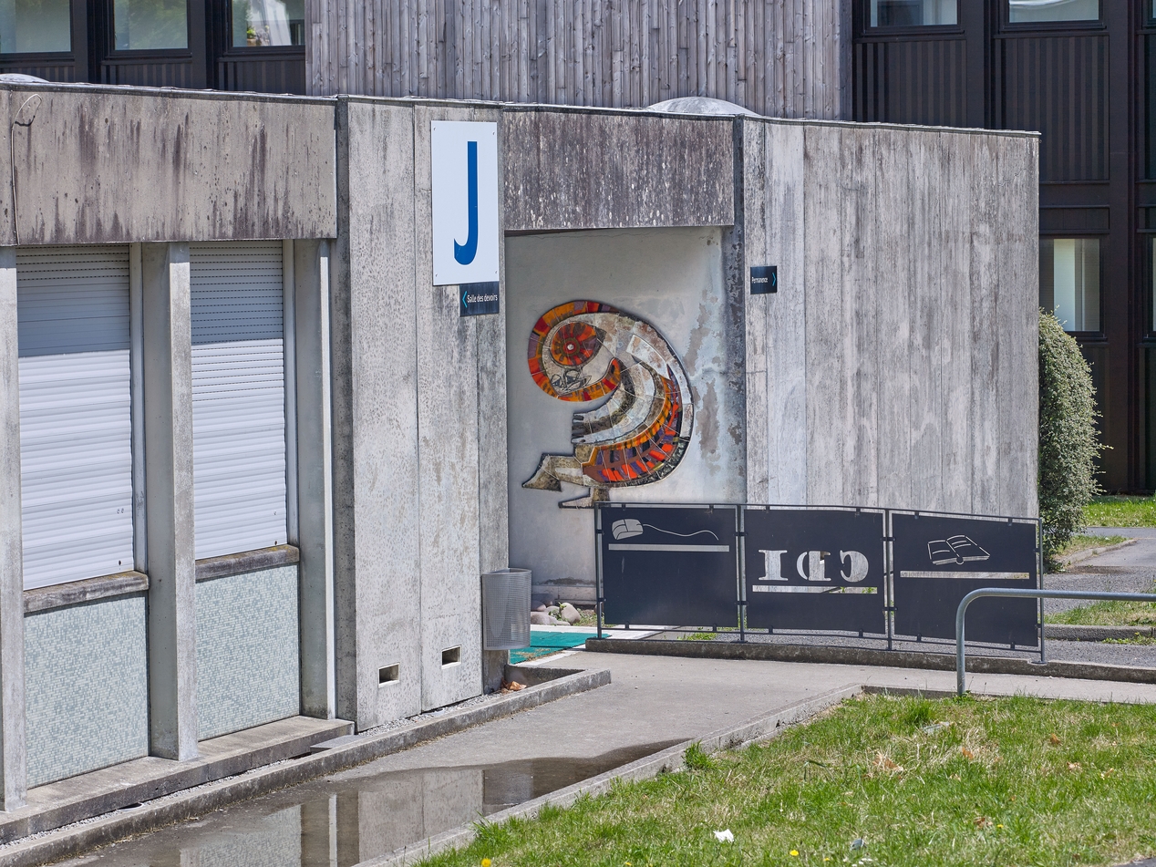 Fañch Michelet-Nicolas : céramique sur le thème "la découverte, la connaissance". Vue de situation sur le mur de droite du porche d'entrée du CDI (Félix Le Saint et Jacques Olivier, architectes, 1974)Immatriculation