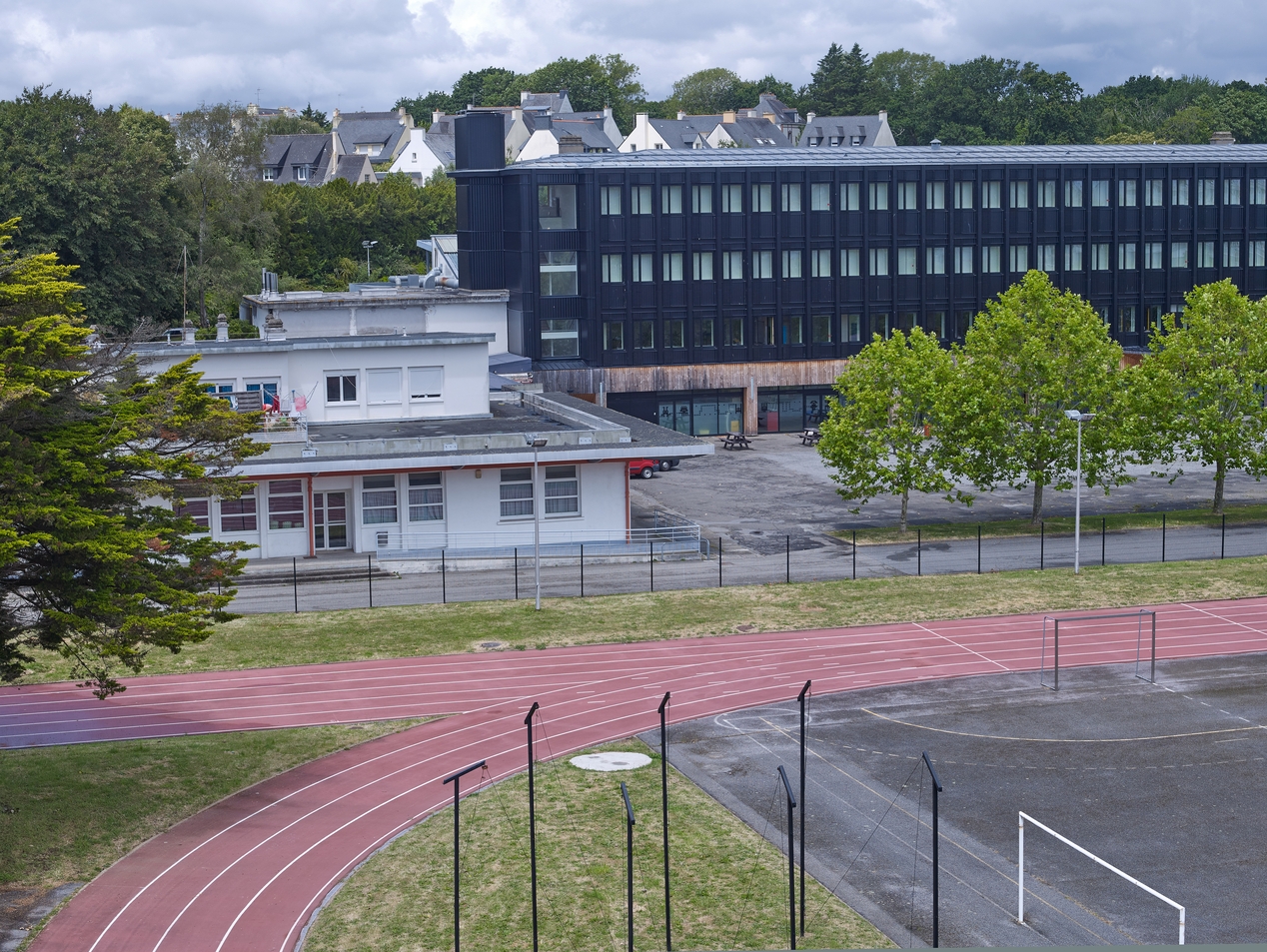 Le bâtiment de la restauration scolaire (avec logements au premier étage) et le bâtiment B, façades sud-est. Vue prise des étages d'un internat.Immatriculation