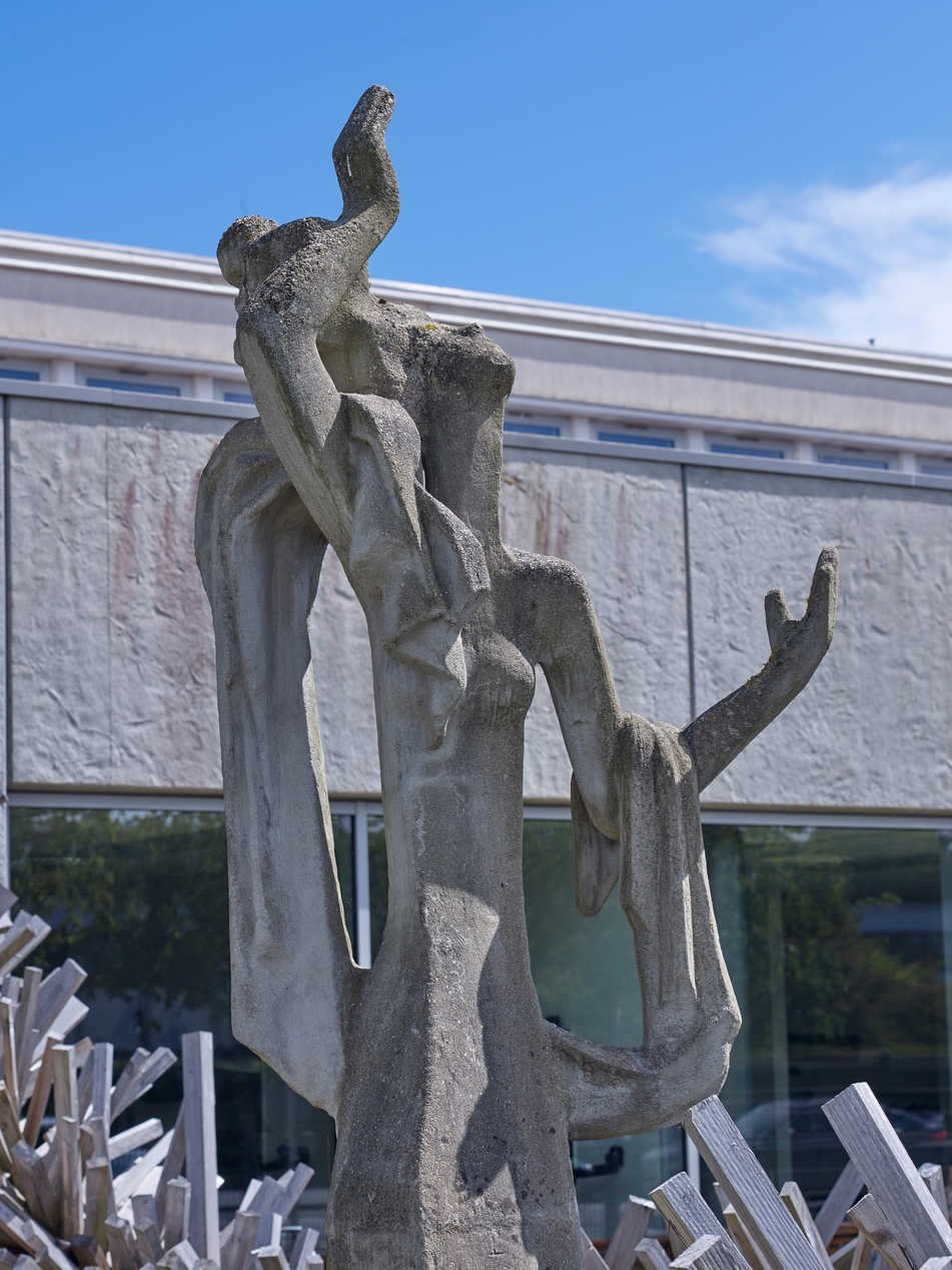 "Hymne à la jeunesse", sculpture en ciment de Guy-Charles Revol, vers 1965. Détail.Immatriculation