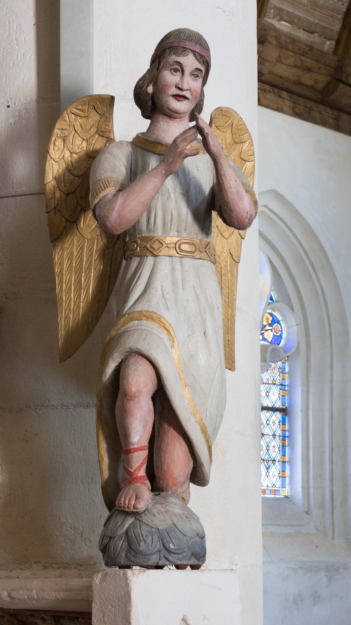 Vue générale : statue d'un ange à genoux.Immatriculation