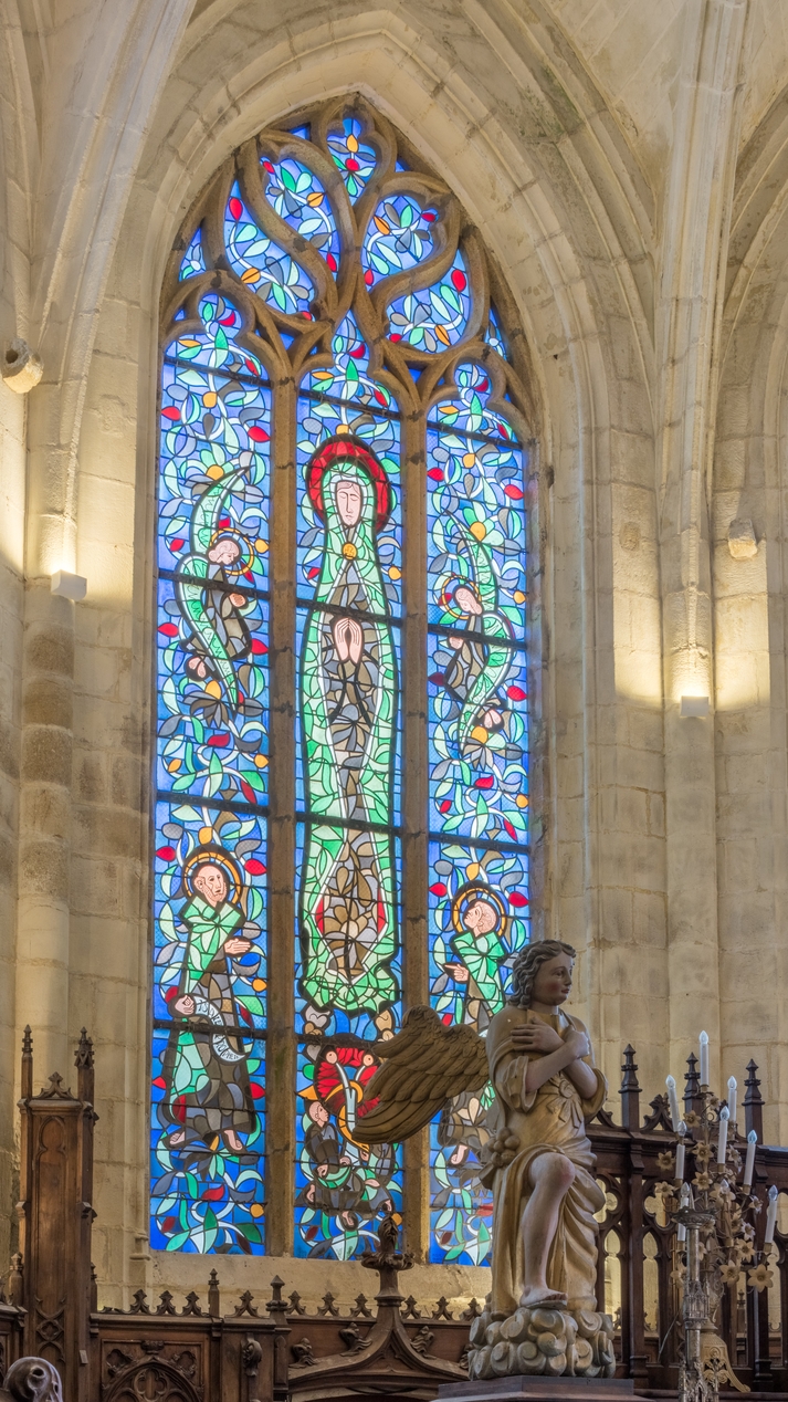 Vue d'ensemble de la baie 0 : maîtresse-vitre représentant la Vierge, entourée d'anges, d'Isaïe et de saint Luc.Immatriculation