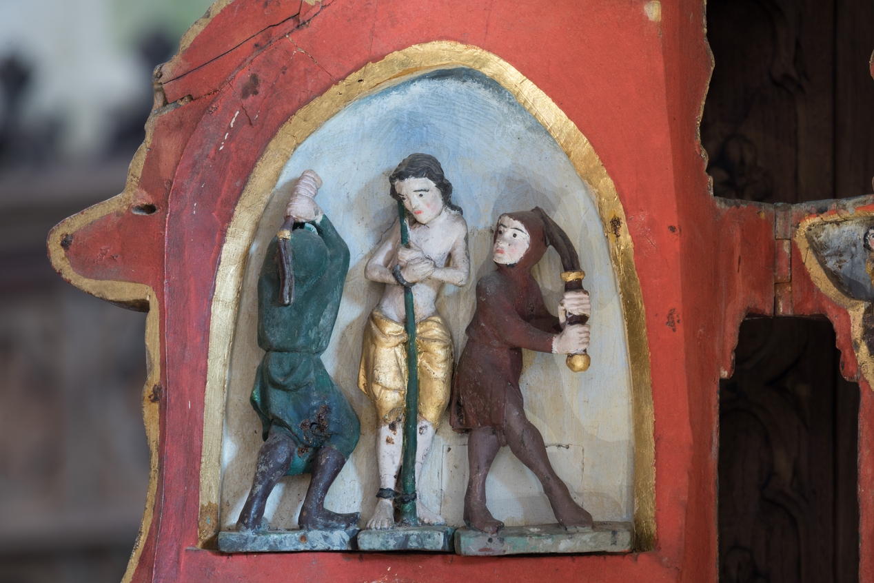 Détail d'une scène de la Vierge ouvrante : flagellation du Christ.Immatriculation