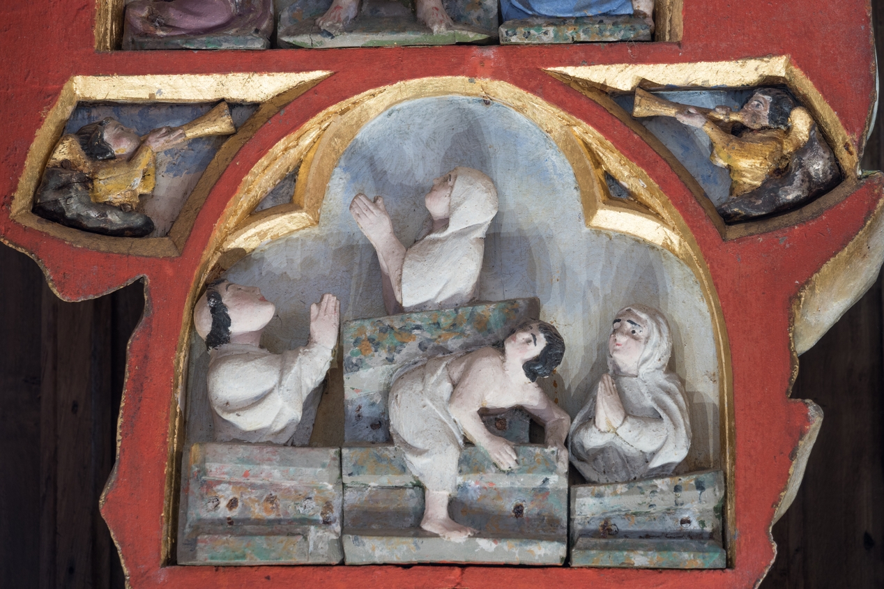 Détail d'une scène de la Vierge ouvrante : Résurrection des morts.Immatriculation