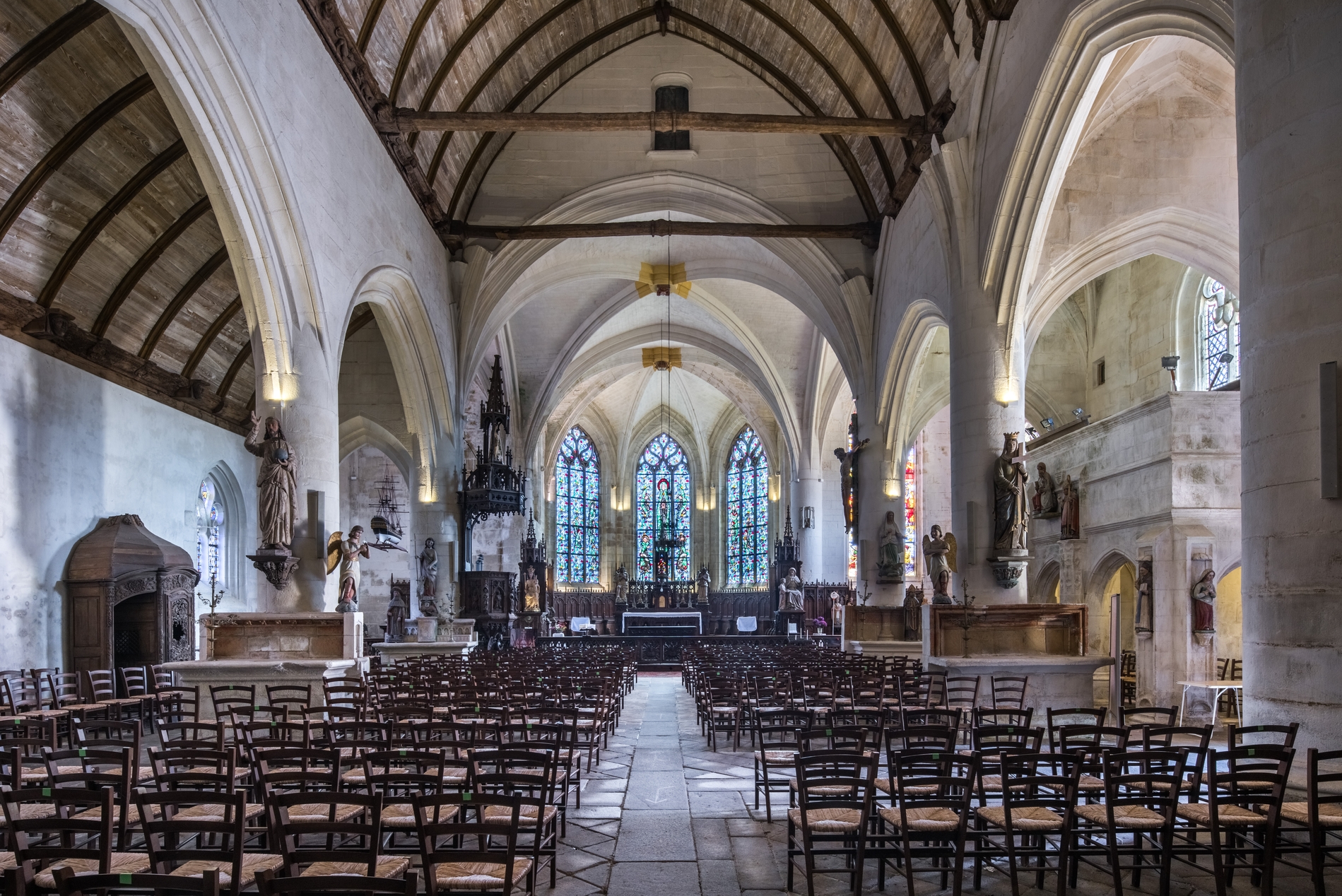 Vue du vaisseau central de la nef et des bas-côtés depuis le fond de la chapelle.Immatriculation