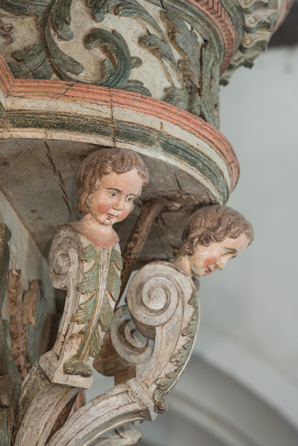 Vue de détail : cul de lampe sculpté de la tourelle du grand orgue.Immatriculation