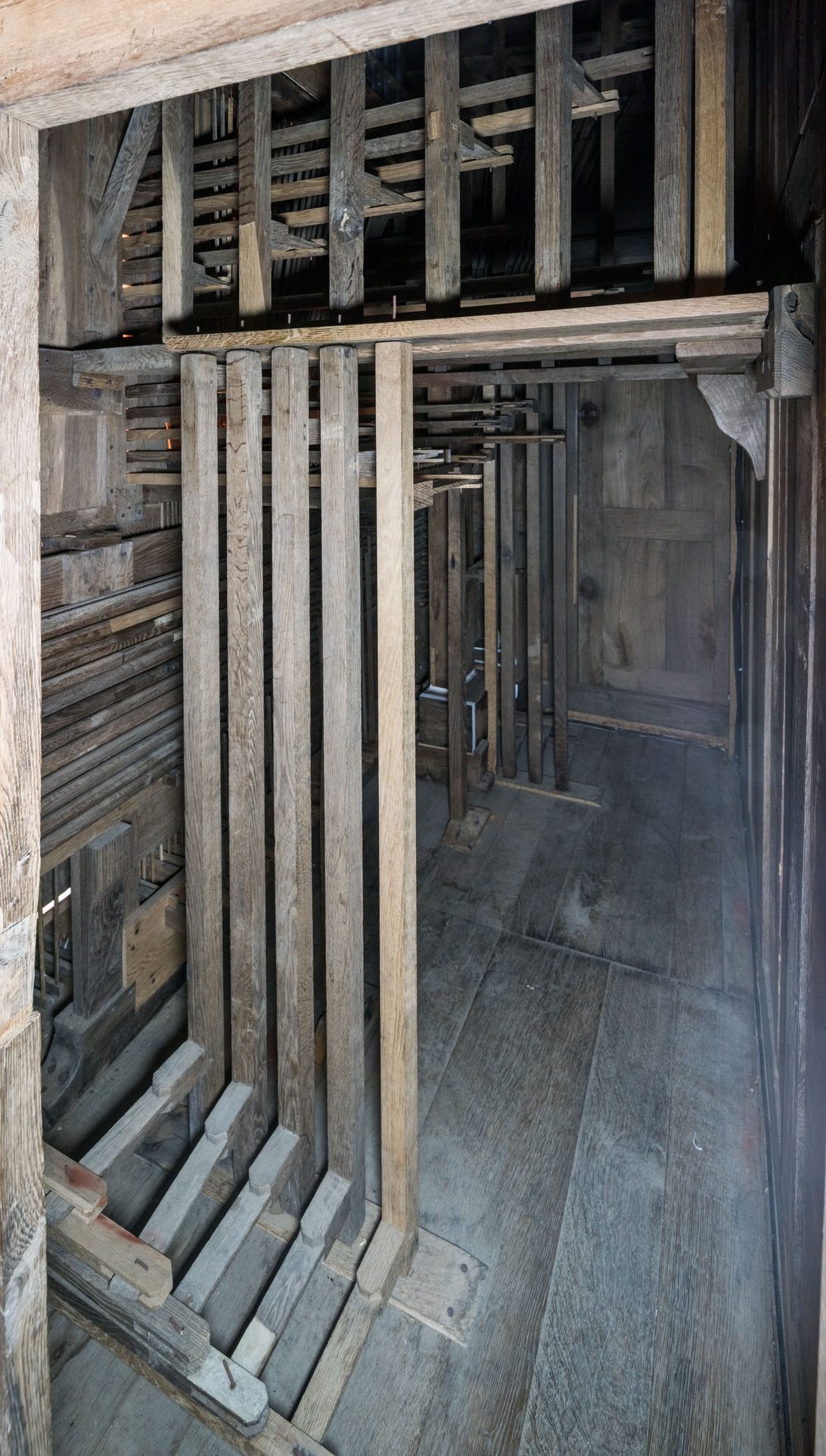 Vue de détail de l'orgue : pilotins (dont un a été reconstitué).Immatriculation
