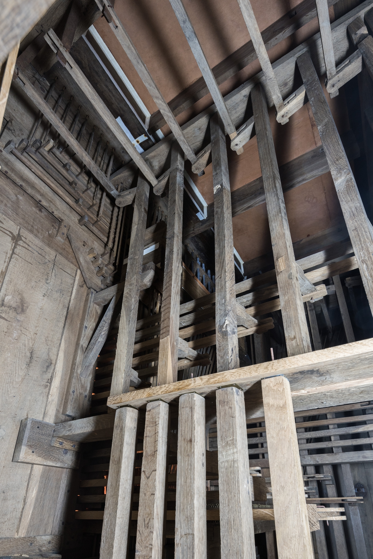 Vue de détail : mécanique du grand orgue et postages vers le cornet d'écho.Immatriculation