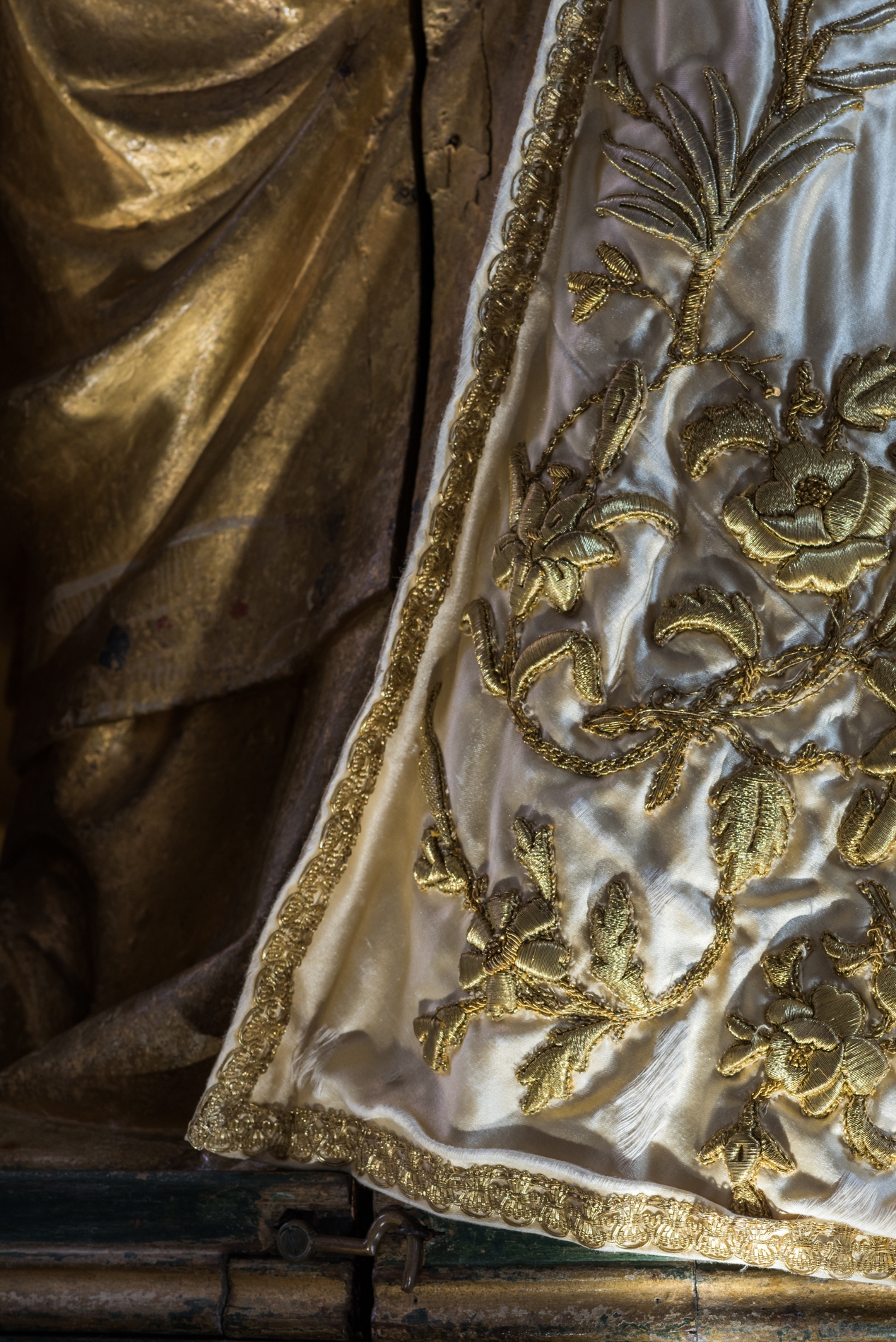 Vue de détail : galon brodé du manteau de procession de la Vierge ouvrante.Immatriculation