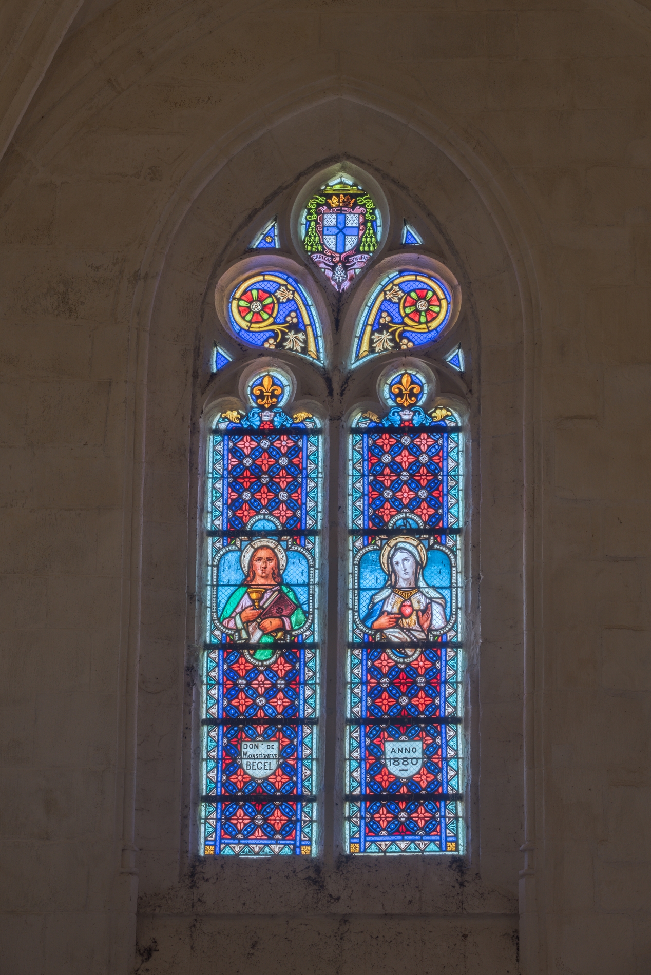Vue d'ensemble : verrière de la baie 12, représentant saint Jean l'Evangéliste et la Vierge du Sacré-Coeur en buste, dans des médaillons.Immatriculation