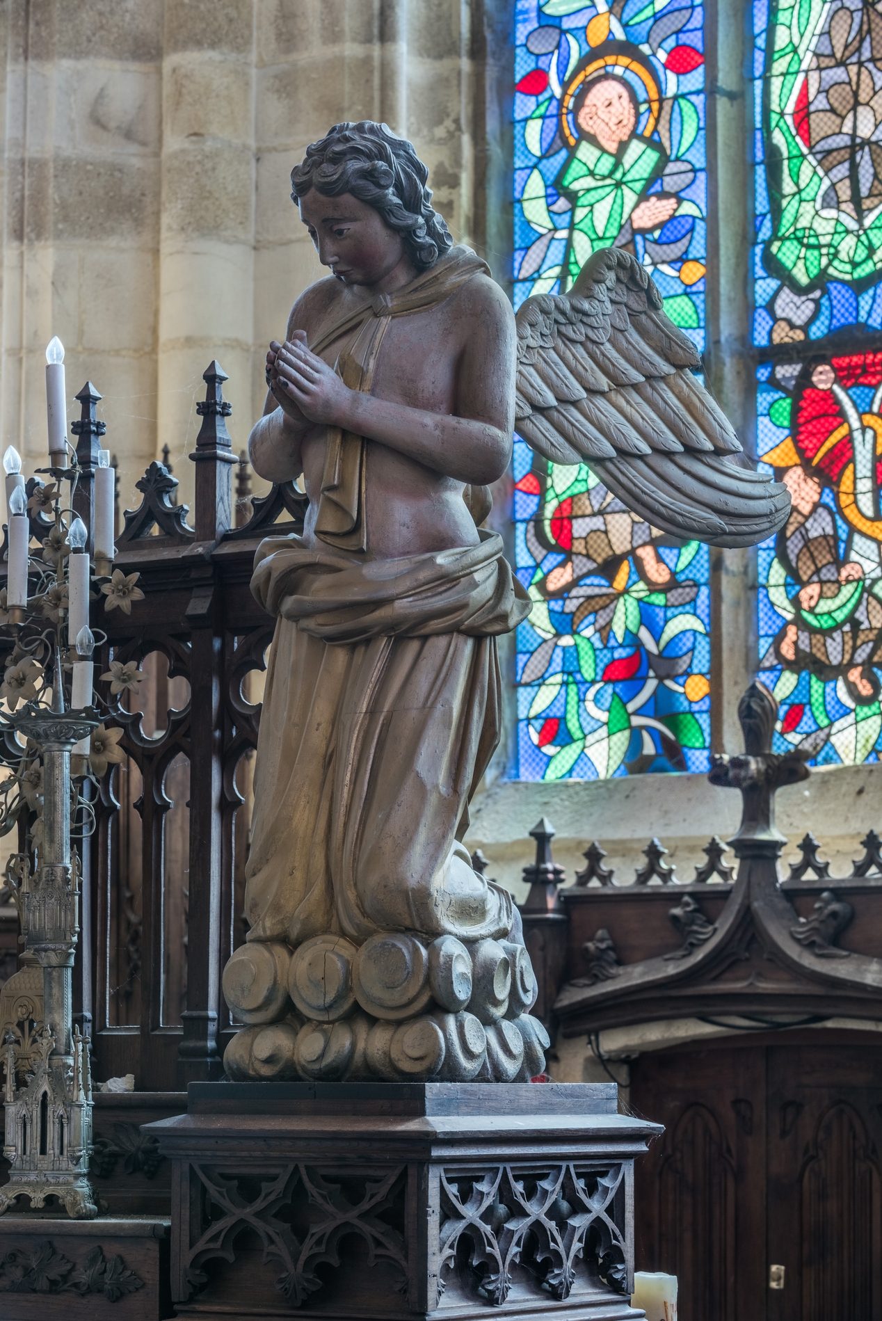 Vue d'ensemble : statue représentant un ange en prière sur une nuée.Immatriculation