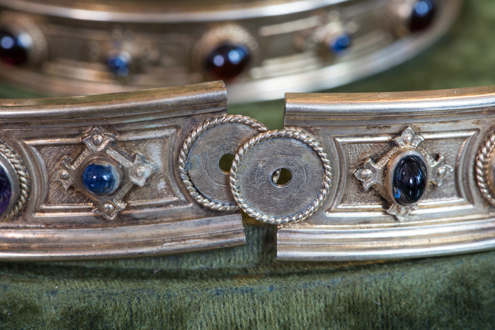 Vue de détail : fermoir d'une des deux couronnes de procession de la Vierge ouvrante.Immatriculation