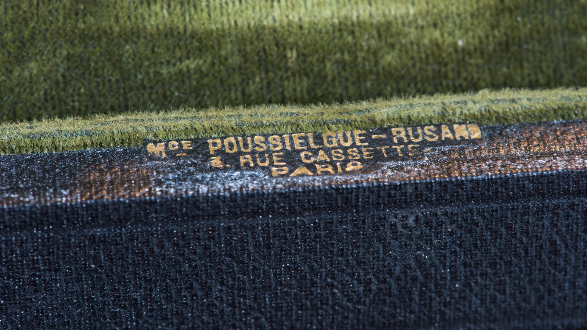 Vue de détail : marque d'ofèvre imprimée sur le rebord du coffret des couronnes de procession de la Vierge ouvrante ("Mce POUSSIELGUE-RUSAND 3, RUE CASSETTE, PARIS").Immatriculation