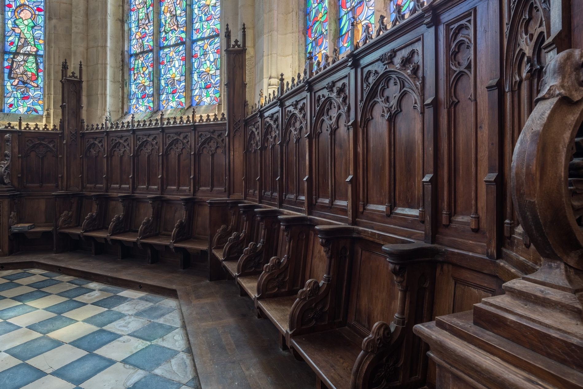 Vue d'ensemble : stalles et boiseries du choeur.Immatriculation