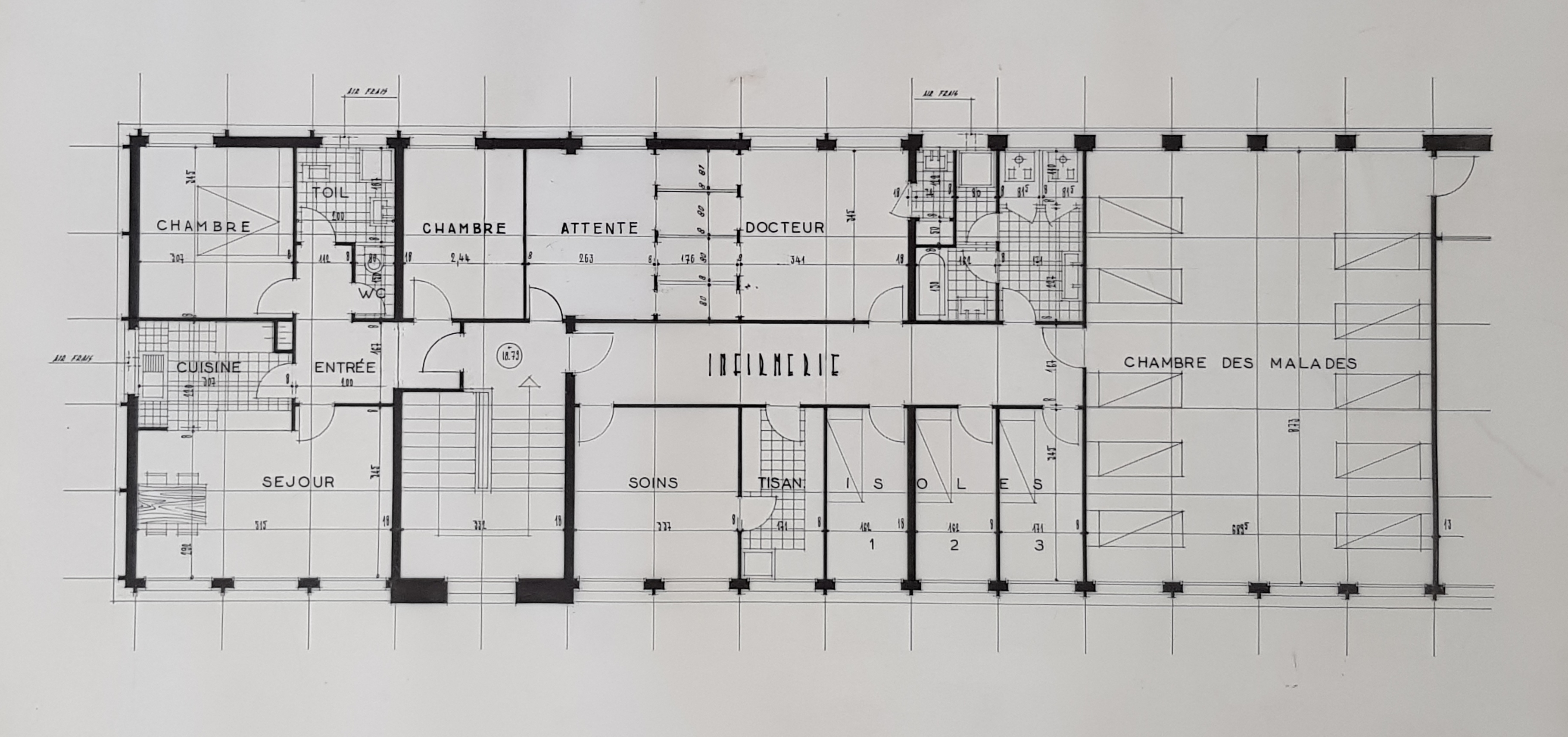 Plan de l'infirmerie (Yves Guillou architecte), avec logement T3, salle d'attente, cabinet du docteur, salle de soins, chambres d'isolés (une trame) et chambre collective pour les malades (10 lits, 4 trames), bloc sanitaire et tisanerie.Immatriculation