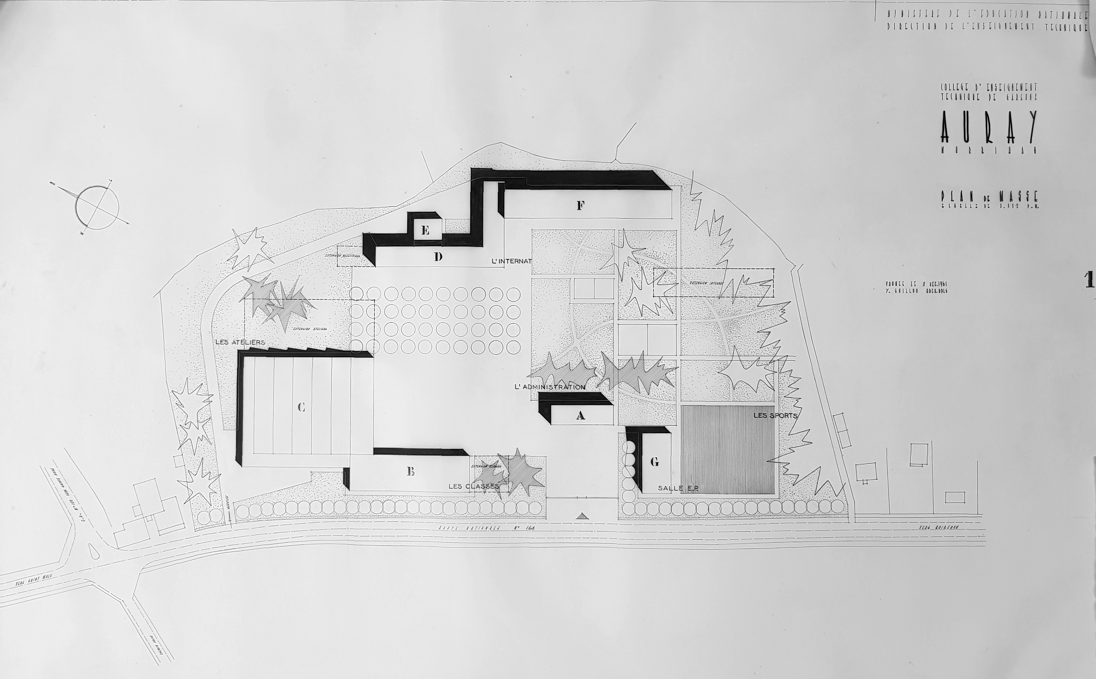 Plan de masse définitif (Yves Guillou architecte, décembre 1961). Noter les emplacements réservés à d'éventuelles extensions futures.Immatriculation