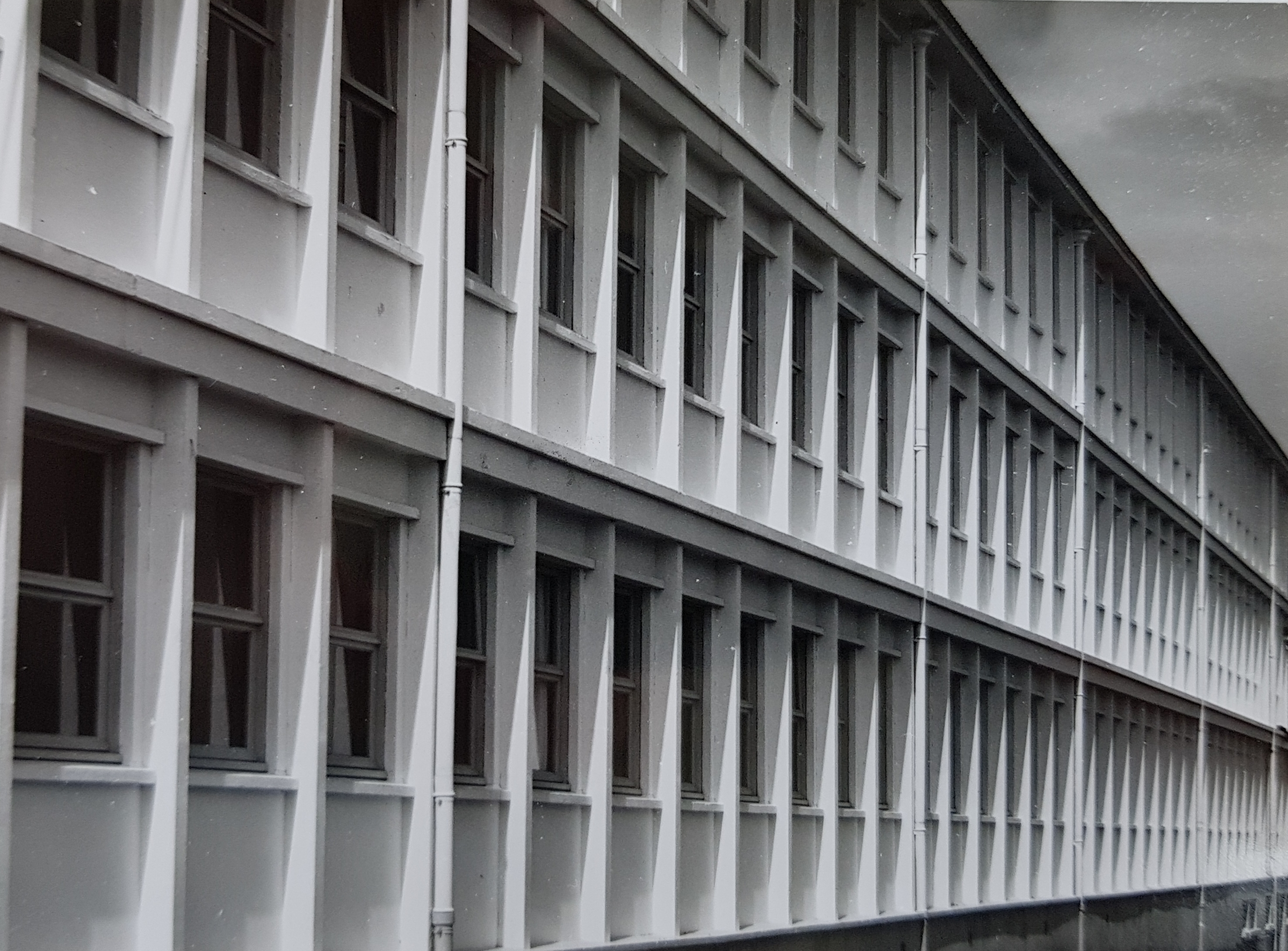 Détail sur la trame de la façade des internats. Le principe constructif (poteaux et poutres en béton forment la structure, trame régulière de 1,75m, répétition des modules fenêtre - allège...) est très lisible. (Yves Guillou architecte, photo ca. 1963).Immatriculation