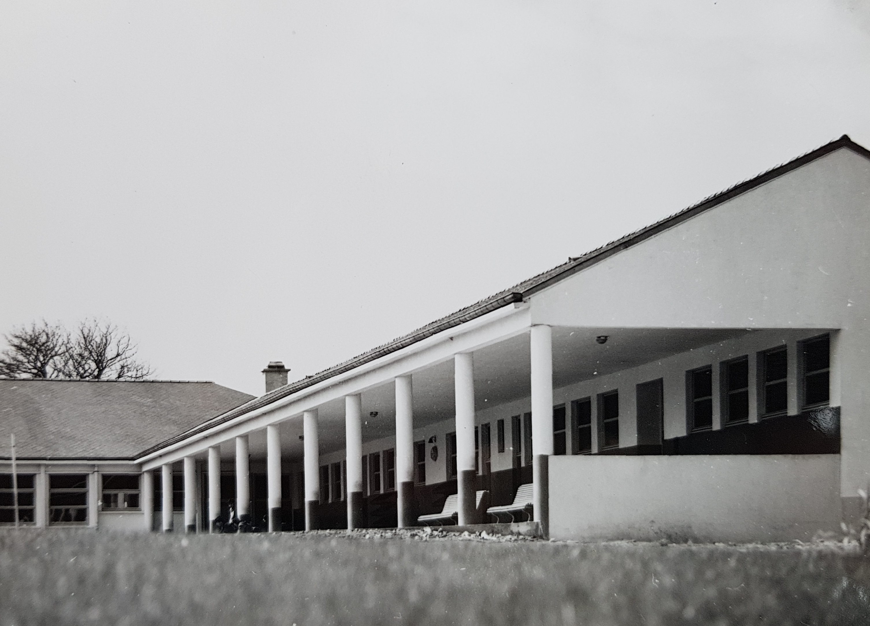 Préau devant les ateliers, à l'arrière plan, vue partielle de l'externat (Yves Guillou architecte, photo ca. 1963).Immatriculation