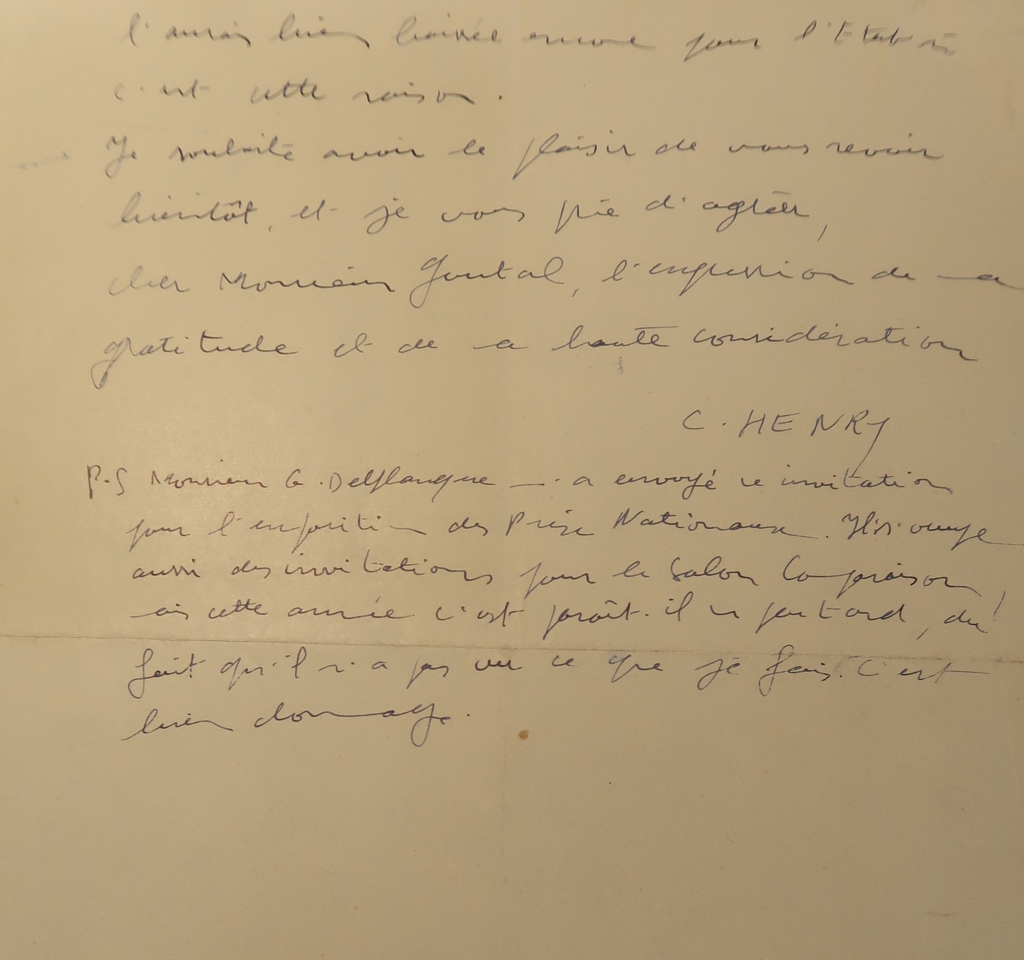 Verso de la lettre de l'artiste Claudine Henry à Pierre Goutal, inspecteur général des Arts graphiques et plastiques, le 27/11/1963, entre deux réunions de la commission nationale du 1%. NB : il est question dans la lettre de M. Legueult. Il s'agit probablement de Raymond Legueult (1898 -1971), chef d'atelier peinture à l'École nationale supérieure des beaux-arts, de 1952 à 1968.Immatriculation