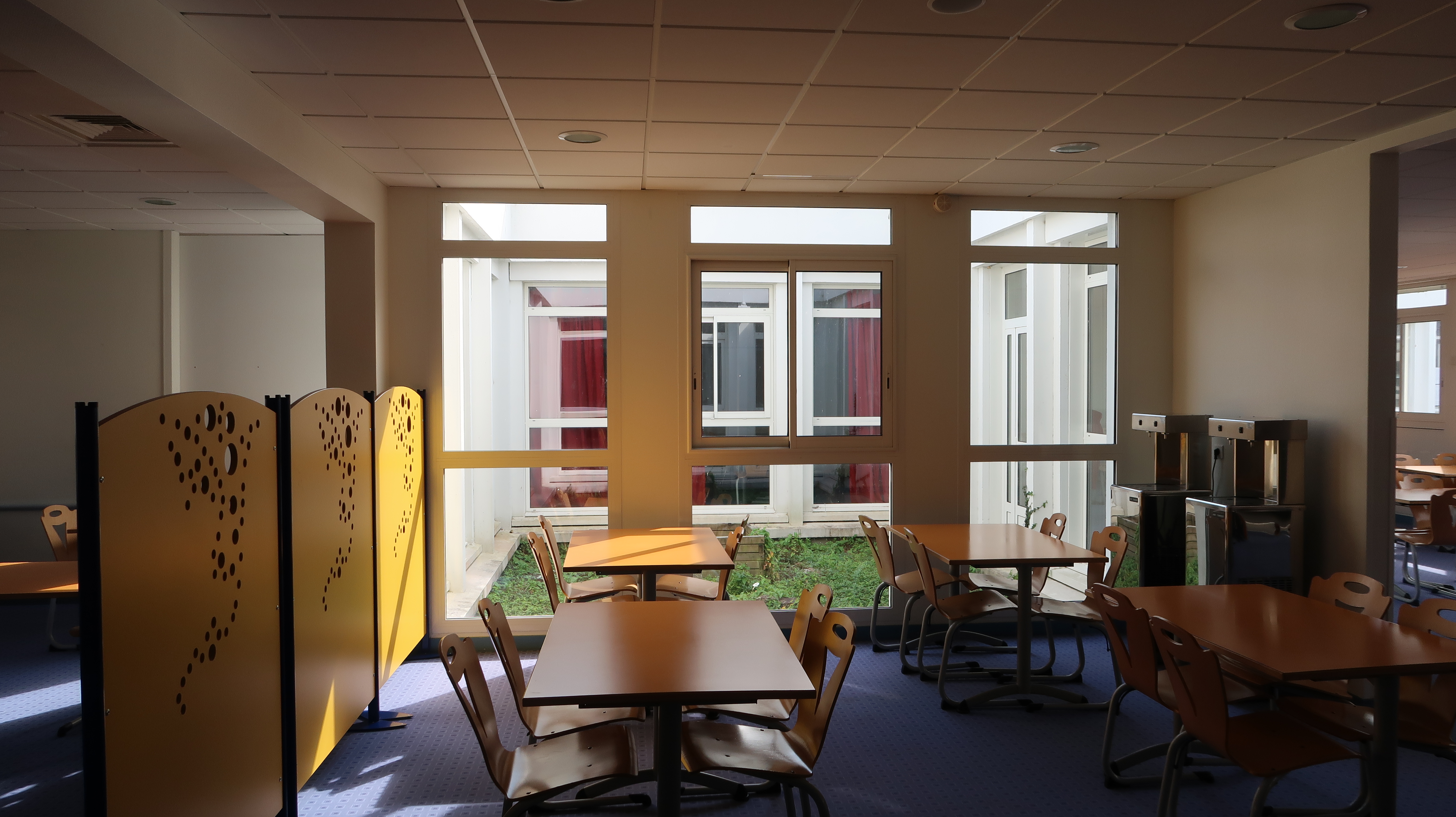 Réfectoire : vue vers le patio. Yves Guillou, architecte, 1969.Immatriculation