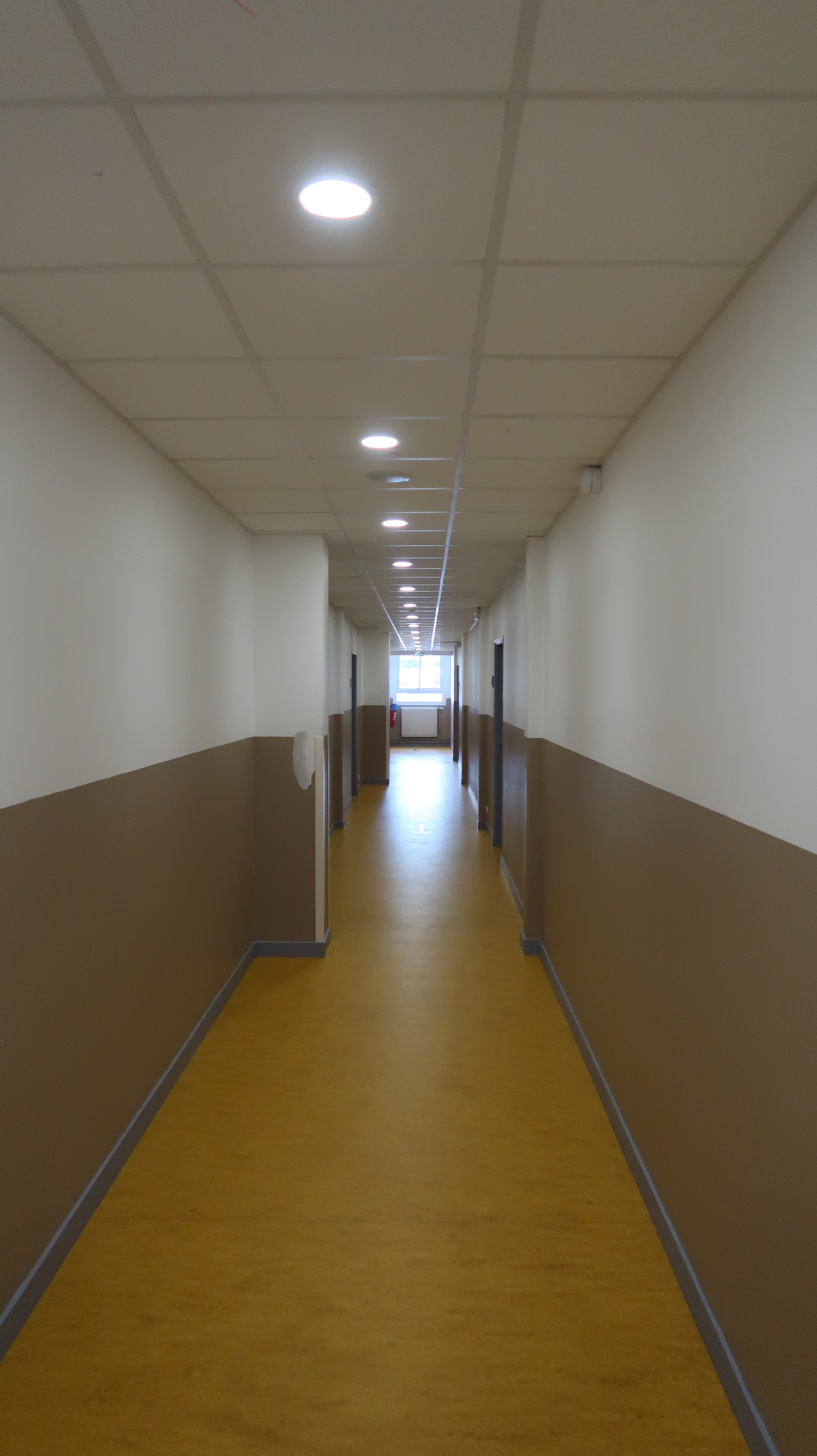 Couloir (distribution centrale), dans l'externat. Yves Guillou, architecte, 1969.Immatriculation