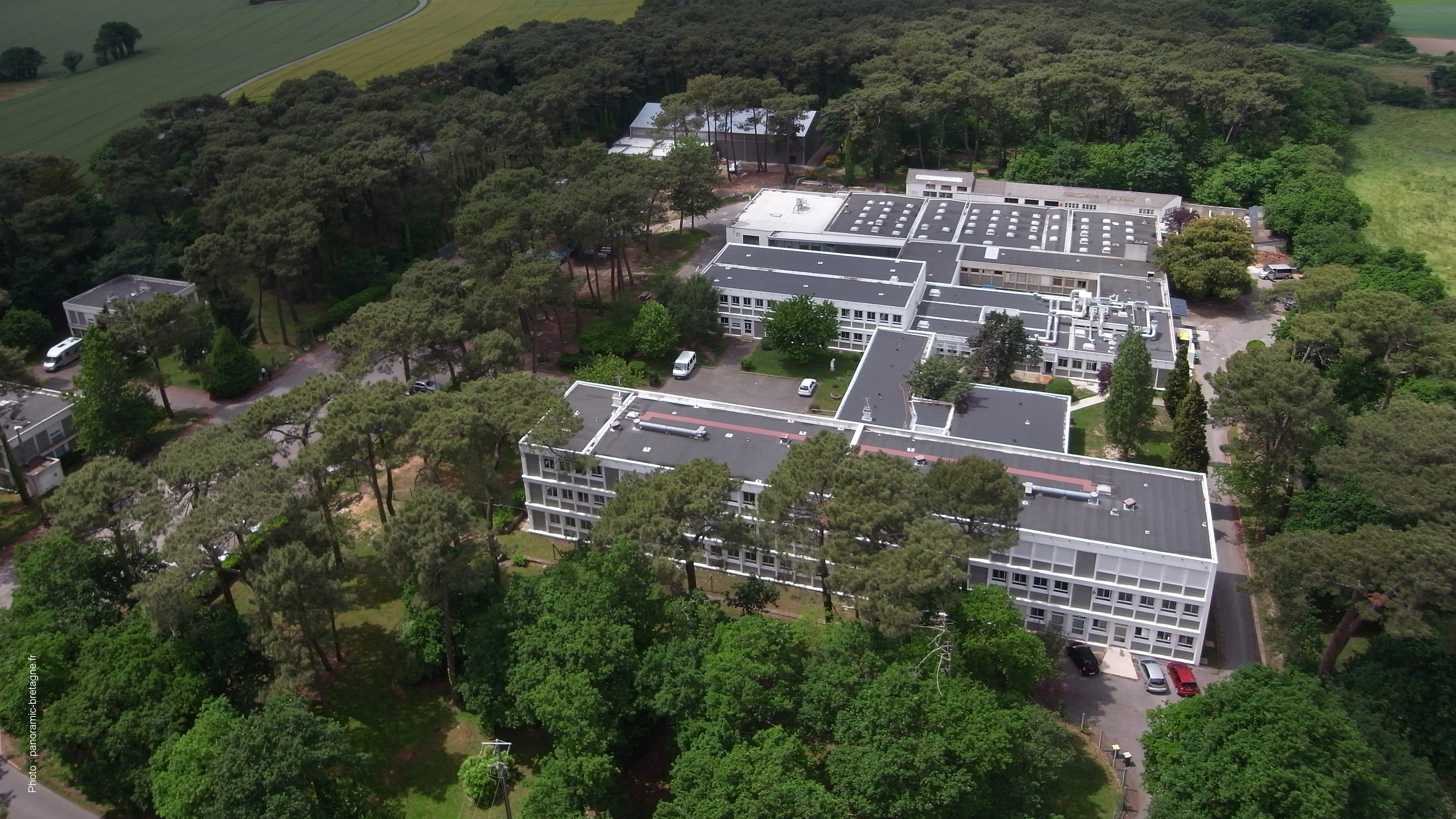 Vue aérienne d'ensemble prise de l'est (2010). A gauche, les deux bâtiments de logements. Au premier plan, l'ensemble Internat, administration, ateliers, restauration scolaire. A l'arrière plan, le gymnase. Noter le cadre paysager.Immatriculation