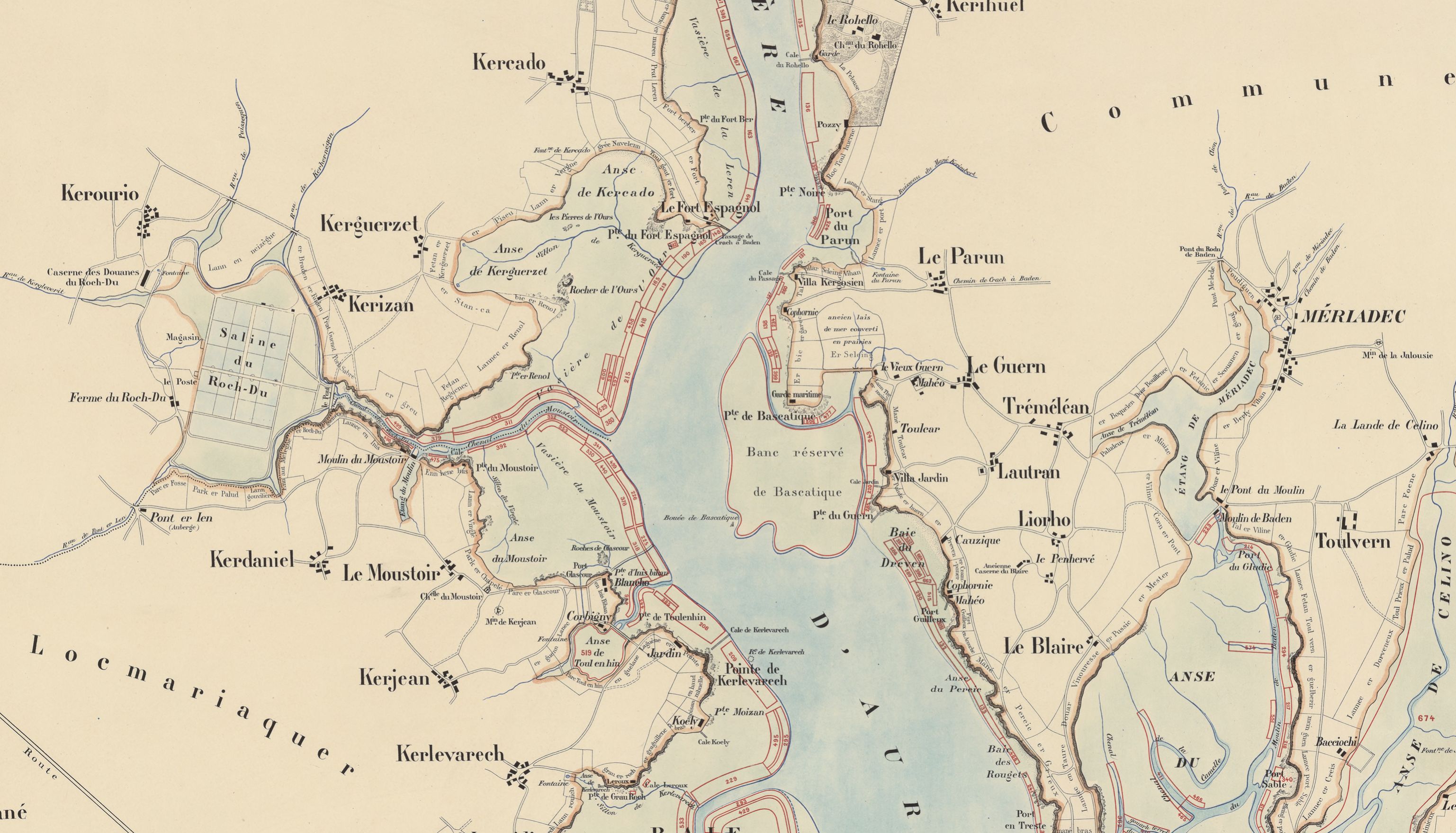 Extrait de la carte des côtes du quartier maritime d'Auray, dressée par D. Ragiot en 1880. Les salines du Roch'Du (Crac'h) et du Guern (Baden).Immatriculation