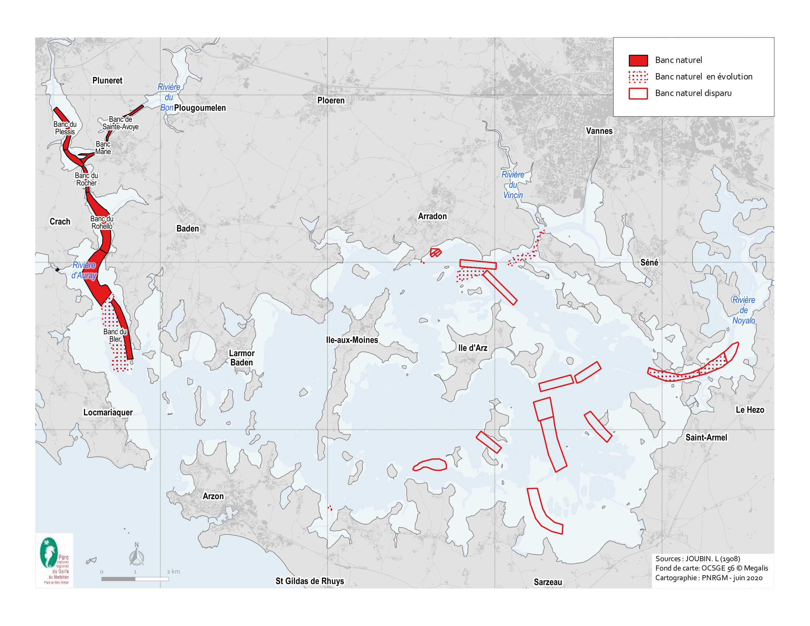 Carte de répartition des bancs naturels d’huîtres dans le Golfe du Morbihan en 1908, d’après les données de Louis JoubinImmatriculation