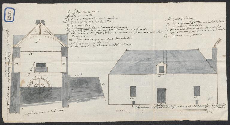 Profil et élevation et façade amont du moulin du Lindin AD56 1Fi 131/17, datation estimée fin 18eImmatriculation