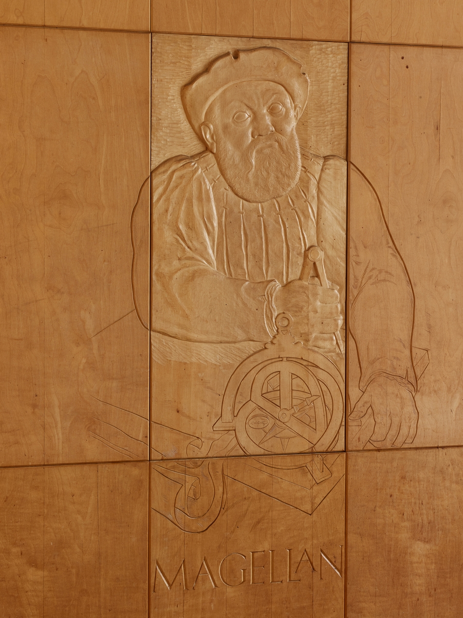 Ensemble sculpté de Séraphin Gilly (1963), "Les grands marins de tous les temps". Vue de détail : Magellan. Le panneau central est sculpté plus profondément, jusqu'au cœur en sycomore, tandis que les panneaux périphériques sont simplement gravés dans l'épaisseur de l'acajou.Immatriculation