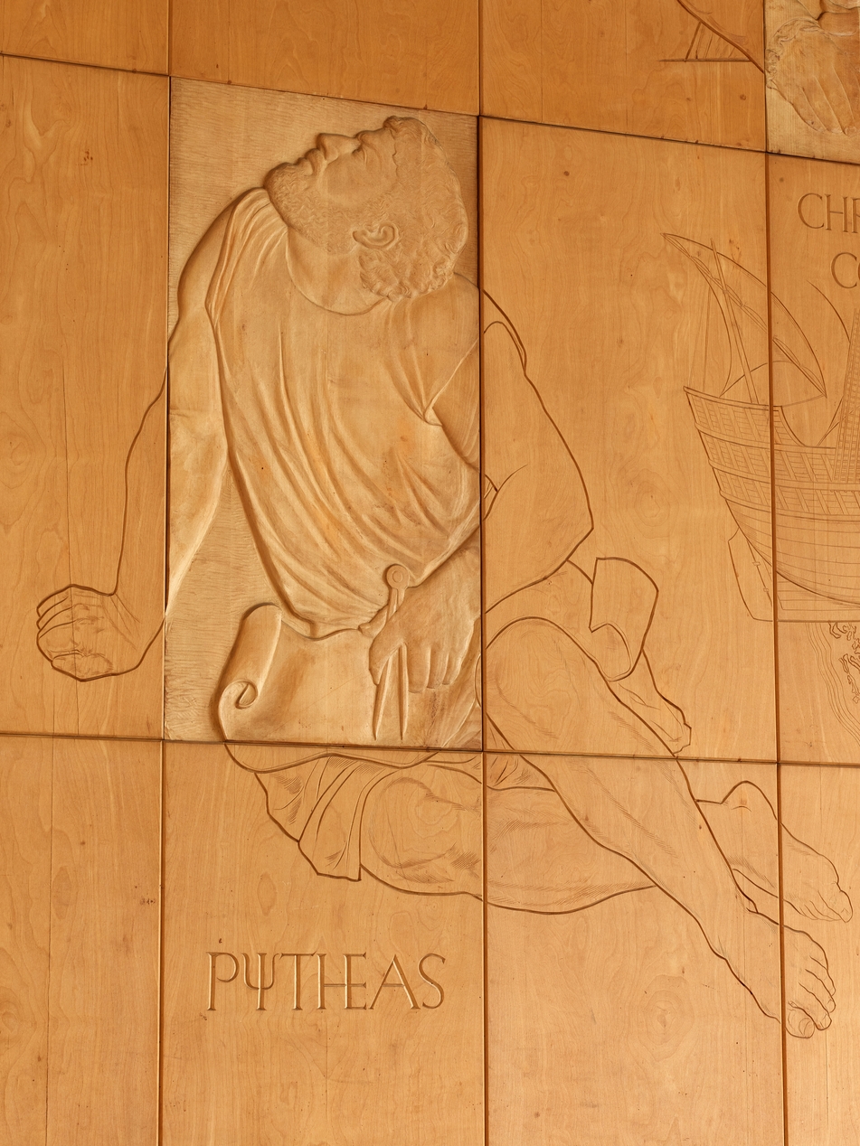 Ensemble sculpté de Séraphin Gilly (1963), "Les grands marins de tous les temps". Vue de détail : Pythéas. Le panneau central est sculpté plus profondément, jusqu'au cœur en sycomore, tandis que les panneaux périphériques sont simplement gravés dans l'épaisseur de l'acajou.Immatriculation