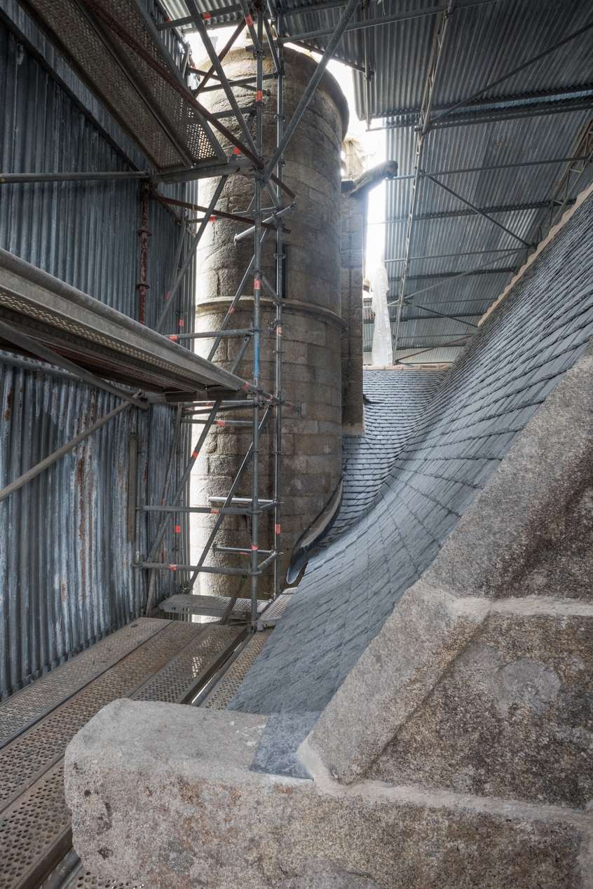 Tour d'escalier du clocher et versant sud de la toiture restaurés (état en 2021)Immatriculation
