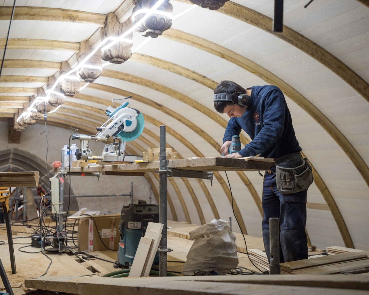 Un charpentier au travail pendant le chantier de reconstruction de la voûte lambrisséeImmatriculation