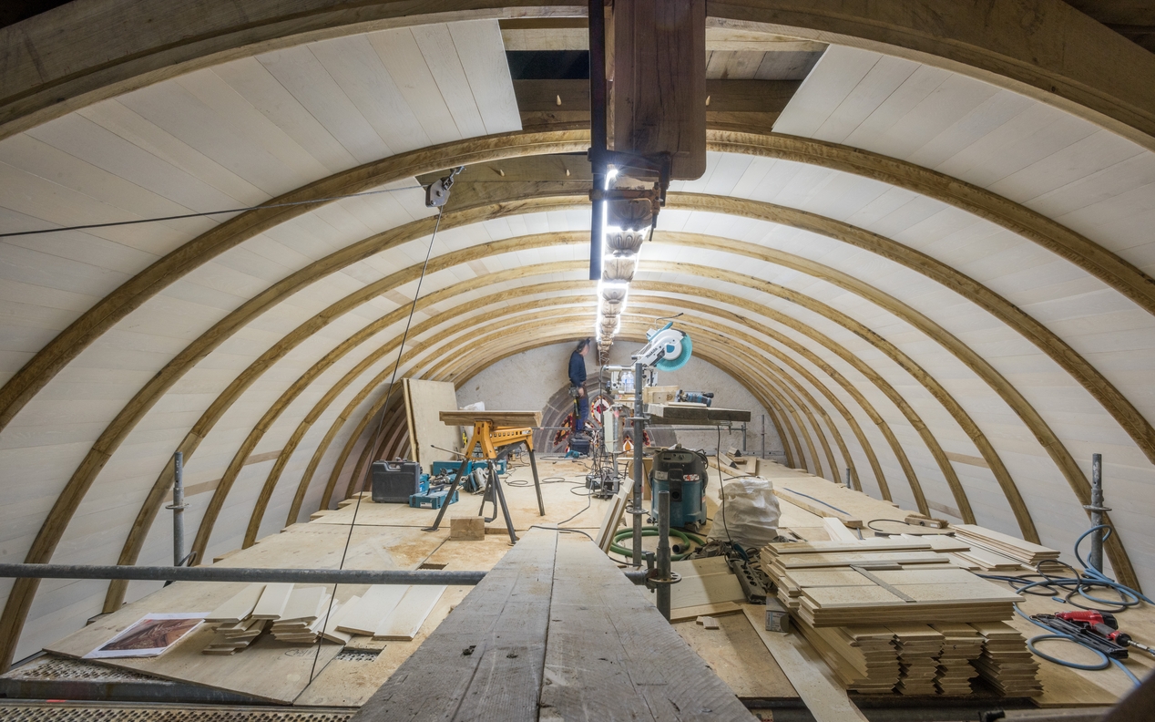 Charpente lambrissée reconstruite suite à l'incendie (état en 2021)Immatriculation