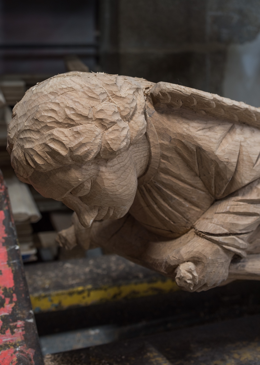 Détail sculpté de la charpente du bas-côté nord, recréée après l'incendie (état 2021)Immatriculation