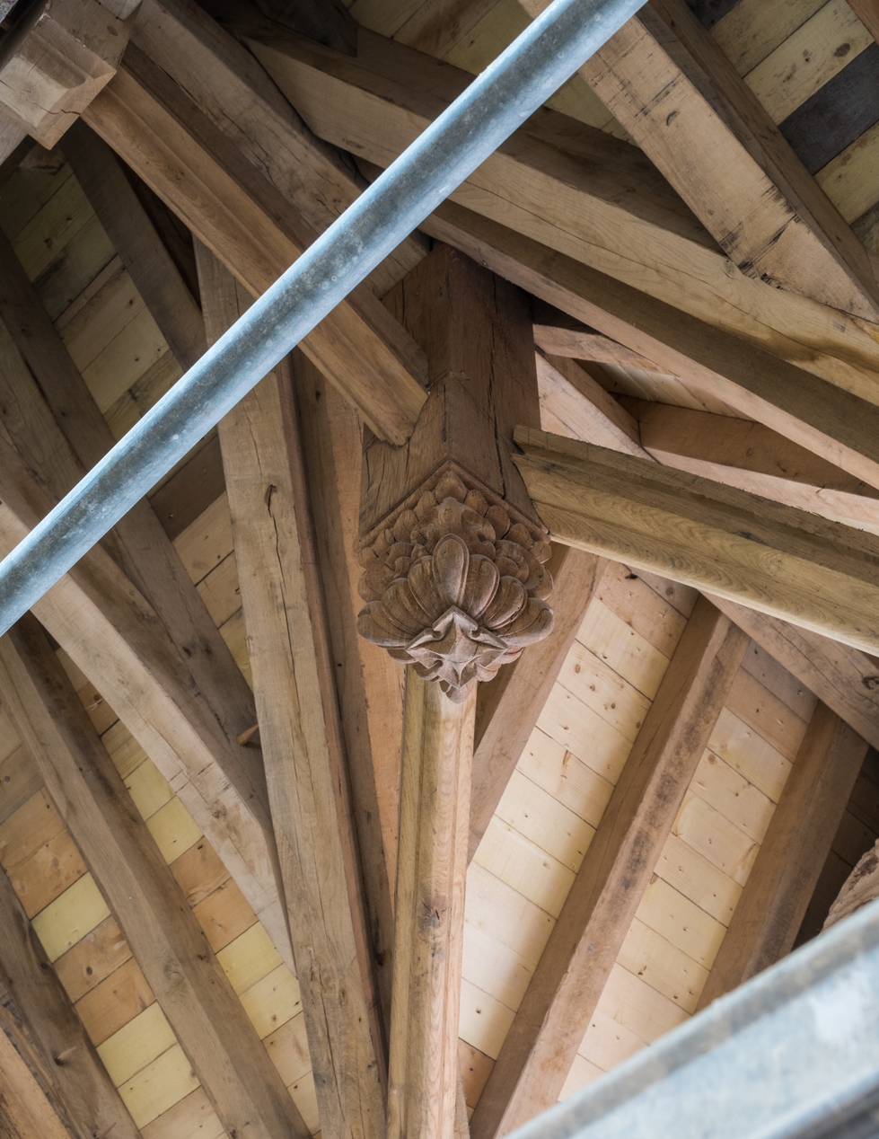 Détail d'une clef de la charpente recréée après l'incendie (état en 2021)Immatriculation