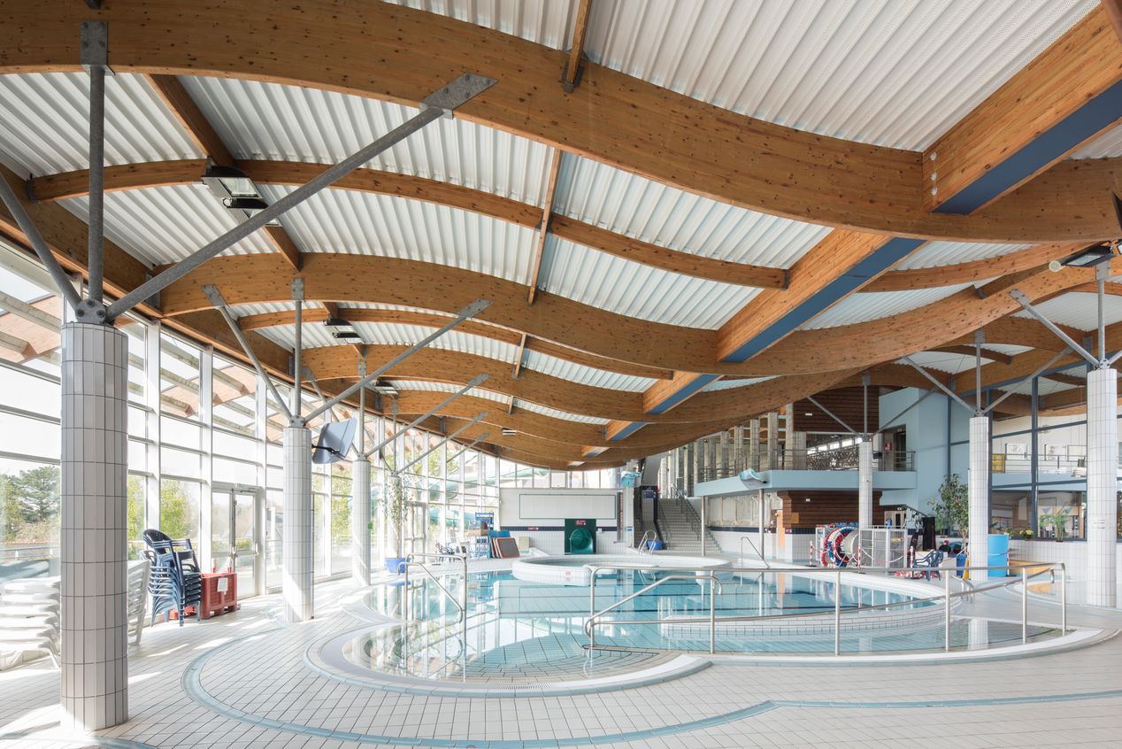 La forme de la charpente en lamellé-collé rappelle l'ondulation des vagues.Immatriculation