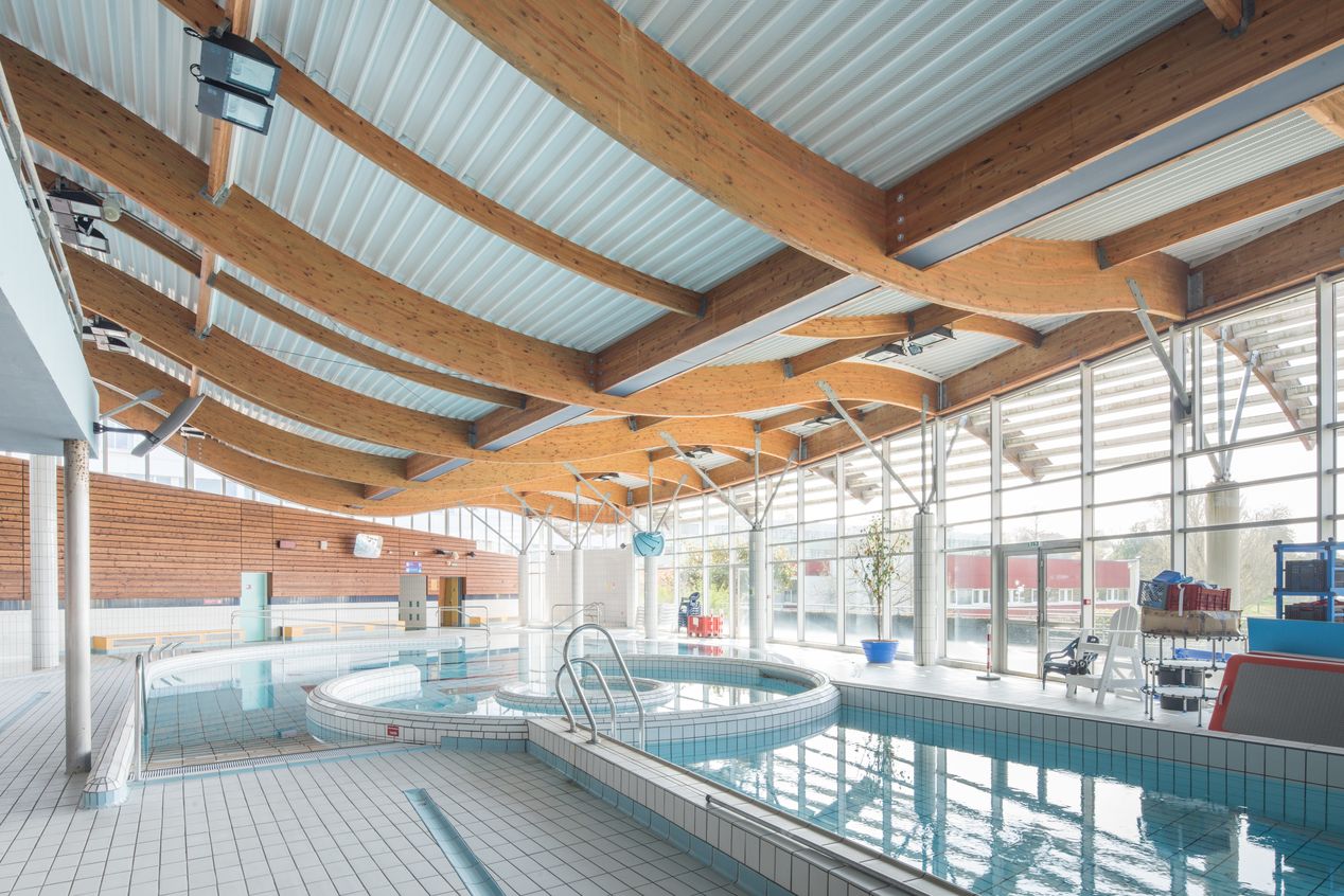 La forme de la charpente en lamellé-collé rappelle l'ondulation des vagues.Immatriculation
