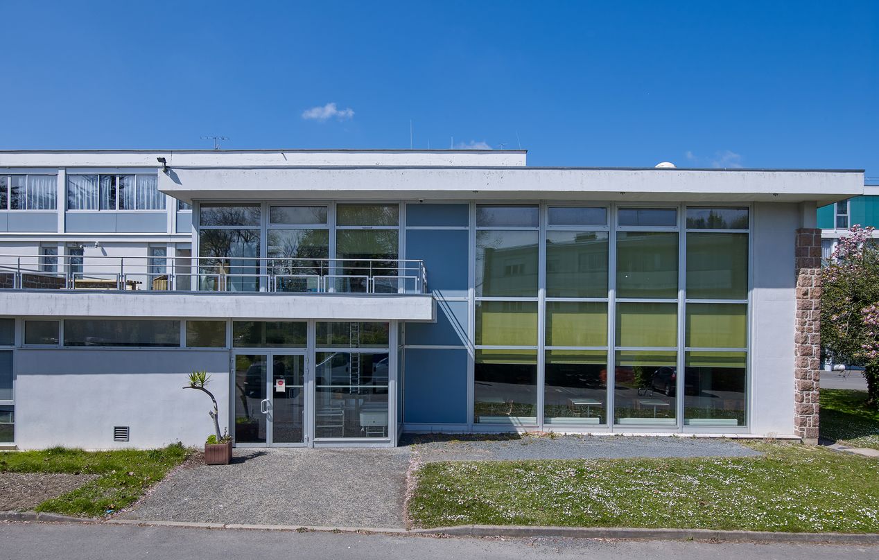 Façade sud-est du service de restauration. Noter la verrière, sur deux niveaux, du réfectoire : un espace conçu à l'origine pour être un hall. R. Hummel, R. Rolland et A. Weinstein, architectes, 1961.Immatriculation