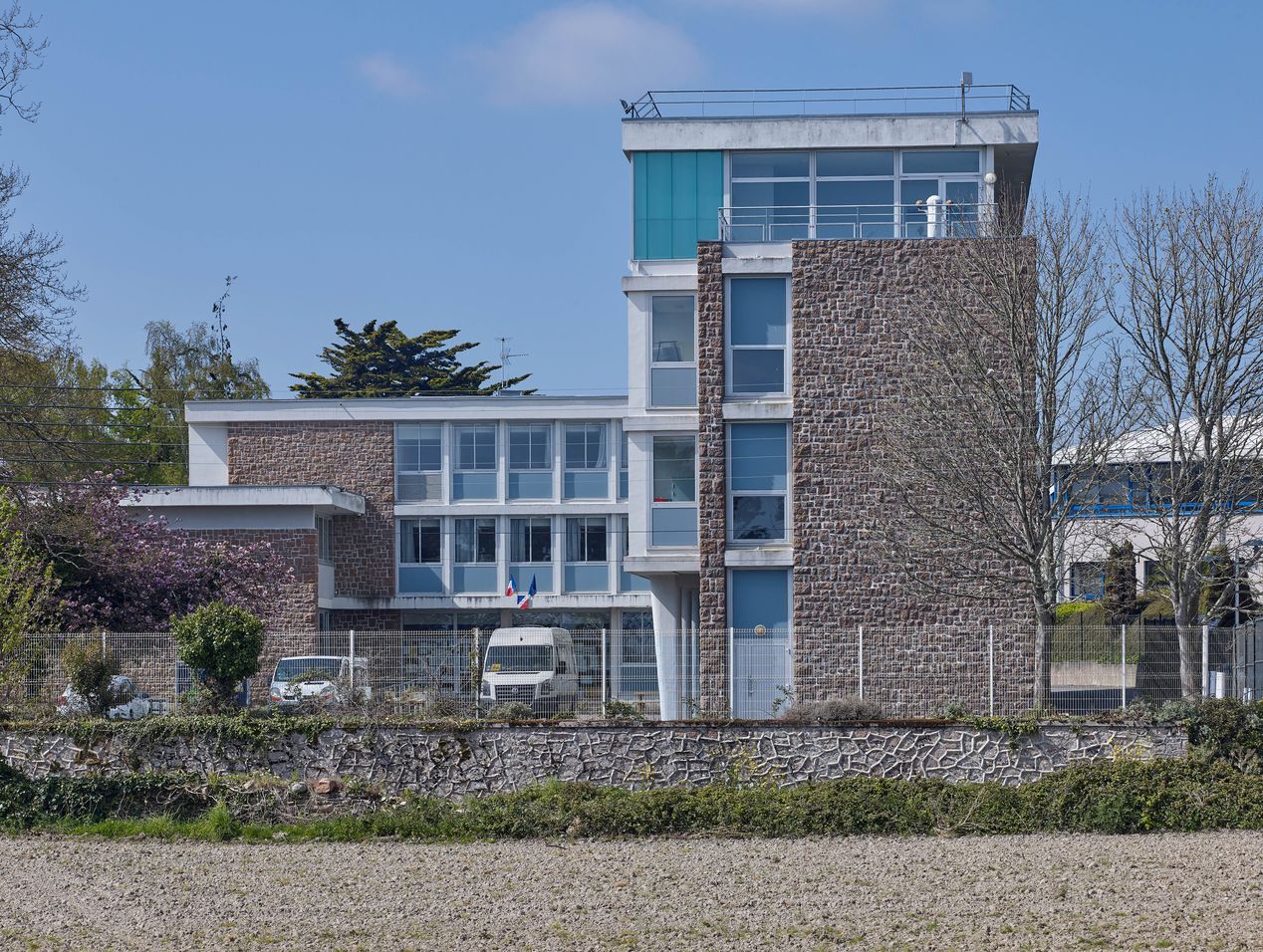 Vue d'ensemble prise du nord-est. De gauche à droite : service de restauration, administration, externat. R. Hummel, R. Rolland et A. Weinstein, architectes, 1961.Immatriculation