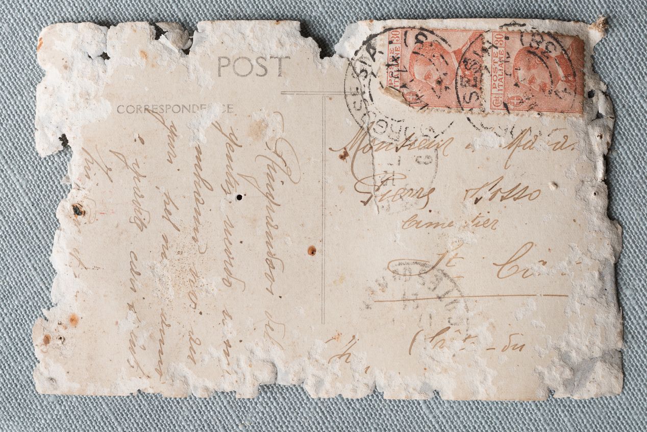 Revers de carte postale adressée à Pierre Dosso, qualifié de cimentier, à Saint-Cast avec texte en italienImmatriculation