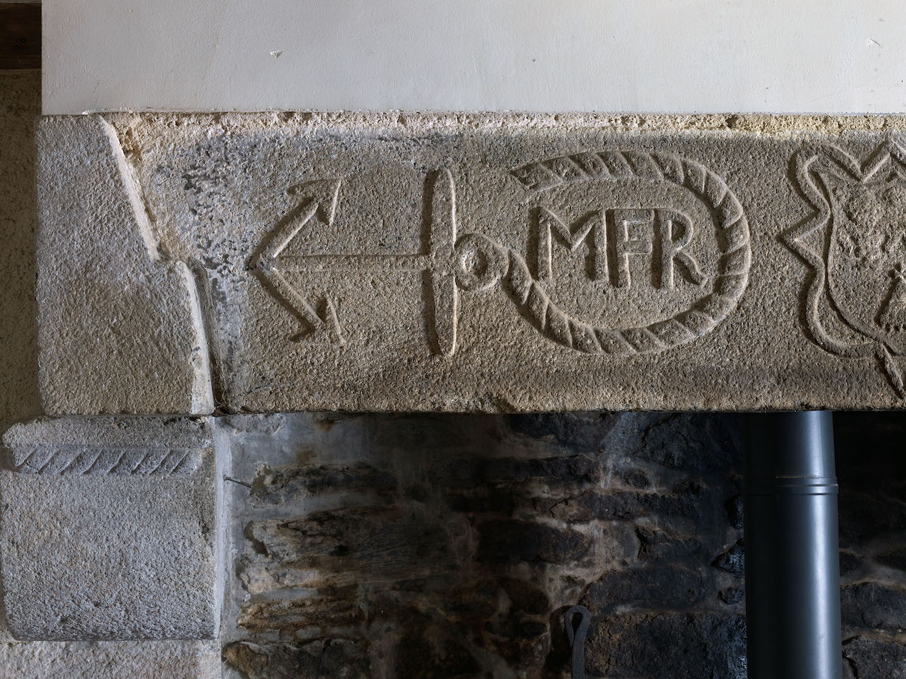 Détail de l'ancre sculptée et des initiales sur le linteau de cheminée (2021)Immatriculation