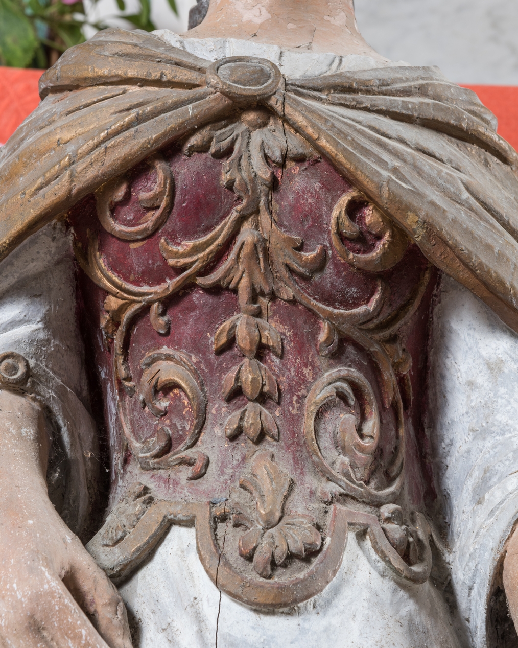 Vue de détail du plastron sculpté d'arabesque et festonné dans la partie inférieureImmatriculation