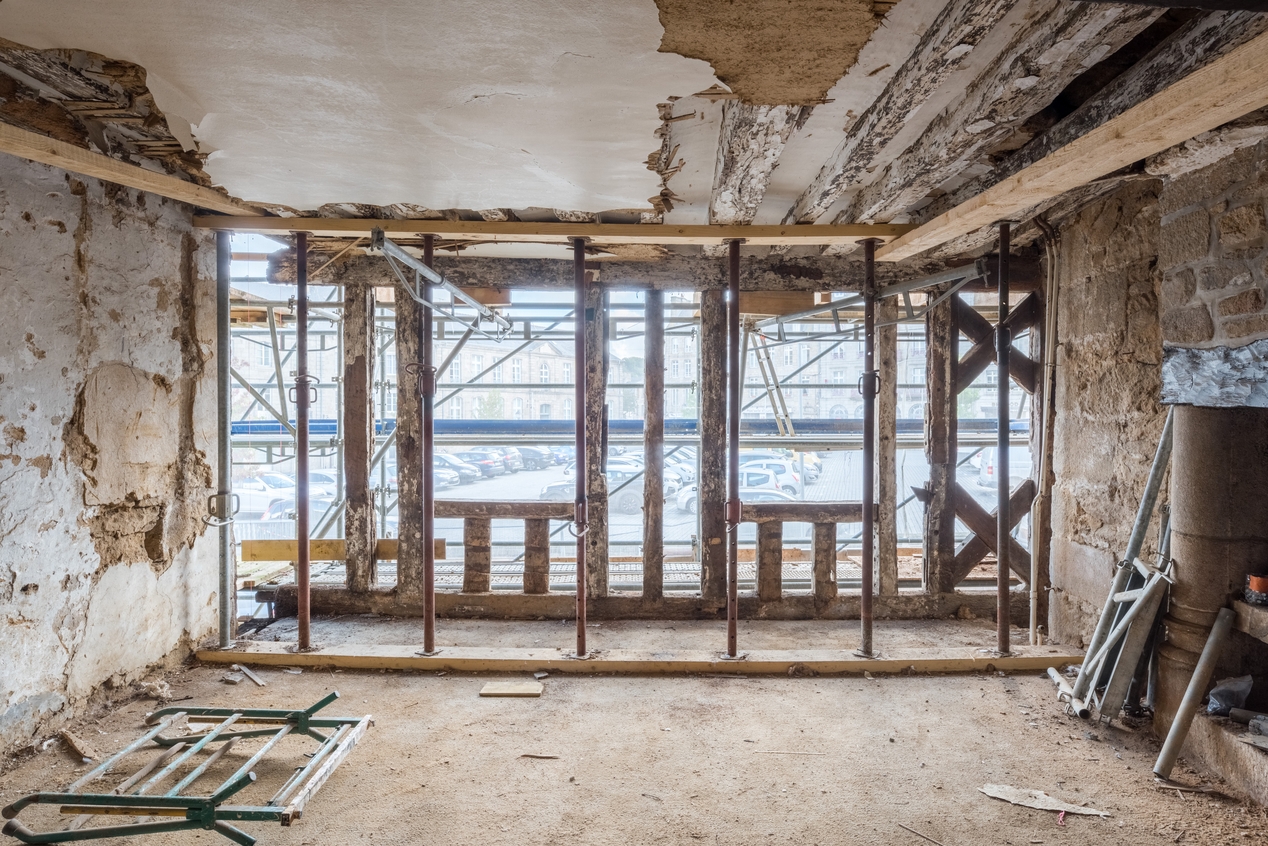 Façade en pan de bois du premier étage, vue de l'intérieur (restauration en 2021).Immatriculation